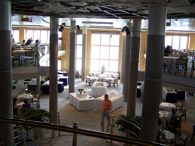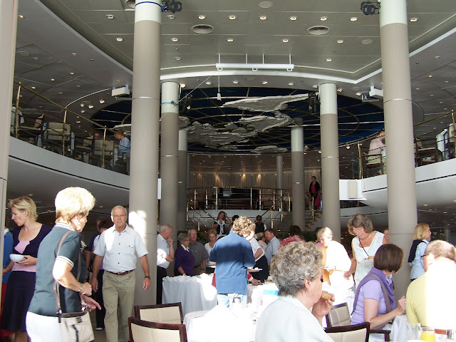 Atlantik heißt das Menü- oder Bedienrestaurant auf Deck 5+6. Wir besuchen es zum ersten Mal am Anreisetag zum Abendessen. Nach kurzer Wartezeit wird uns ein Tisch zugewiesen. Da wir auch mit anderen Gästen zusammensitzen wollen, werden wir an einen großen Tisch auf Deck 6 platziert. Die Menükarte ist ansprechend und bietet für jeden Geschmack eine Auswahl. Alle Speisen können auf der Karte rauf und runter bestellt werden. Die Suppe ist schmackhaft, das Beef auch, aber gewöhnungsbedürftig. Gewöhnungsbedürftig ist der Kellner erst recht. Dass ich das falsche Besteck für die Vorspeise gewählt habe, ist für den Kellner Anlass genug, dies durch das ganze Restaurant zu posaunen. „Na, hat der Herr für die Vorspeise das Besteck für die Hauptspeise gewählt?“ So etwas gehört sich nicht! (Ich meine das Posaunen). Anstatt stillschweigend ein sauberes Hauptspeisebesteck hinzulegen, bleibt das dreckige Besteck liegen. Auch komisch. Als Hauptspeise wählen alle das Rinderfilet und das ist super. Zum Nachtisch gibt es Waldfrüchte, Crepes und eine Käseplatte alles bestens.
