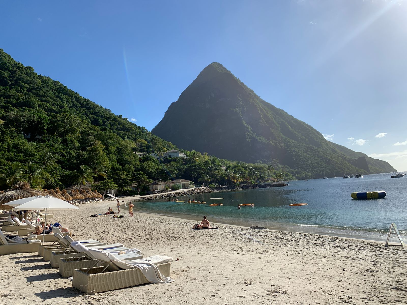 Nicht nur die kurze Fahrt unterhalb des steilen Vulkankegels, auch die Bucht selbst waren en Highlight der gesamten 14-tägigen Reise. Der zugegebener Maßen vor langer Zeit künstlich aufgeschüttete Strand unterhalb des Petit Pitons mit direkten Blick auf den Gros Piton hat mich verzaubert. Ich hätte dort ewig verweilen und den Ausblick genießen können.