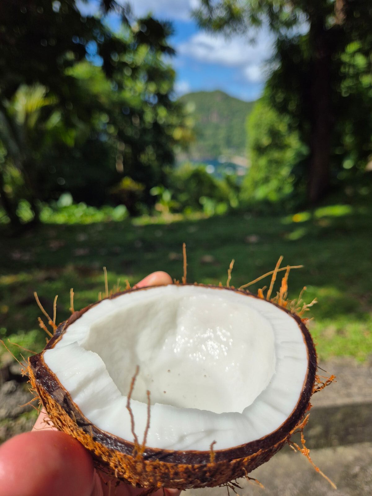 Bevor es zum Hafen von Soufrière ging, legten wir noch einen Halt am "Morne Coubaril Historical Adventure Park" ein. Es handelt sich dabei um eine ehemalige Zuckerrohr Plantage, die sich bis heute zum botanischen Garten verwandelt hat. Calvin zeigte uns dort während eines Spaziergangs unter anderem die Geschichte des Kakao Anbaus. Auch die obligatorische Kokosnuss mit ihrem erfrischenden Wasser durfte hier nicht fehlen.