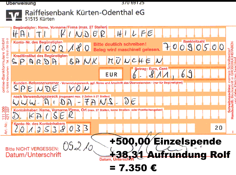 "Uns war es besonders wichtig zu helfen, weil auf der anderen Seite der Insel Hispaniola, der Dominikanischen Republik, Schiffe der AIDA Flotte zu Urlaubsreisen starten und eben nur wenige hundert Kilometer weiter unvorstellbares Leid herrscht.", so Rolf Störmann aus Augsburg, der Betreiber der Internetplattform. "Ich hätte niemals so eine hohe Summe erwartet und freue mich das wir den Kindern helfen können."