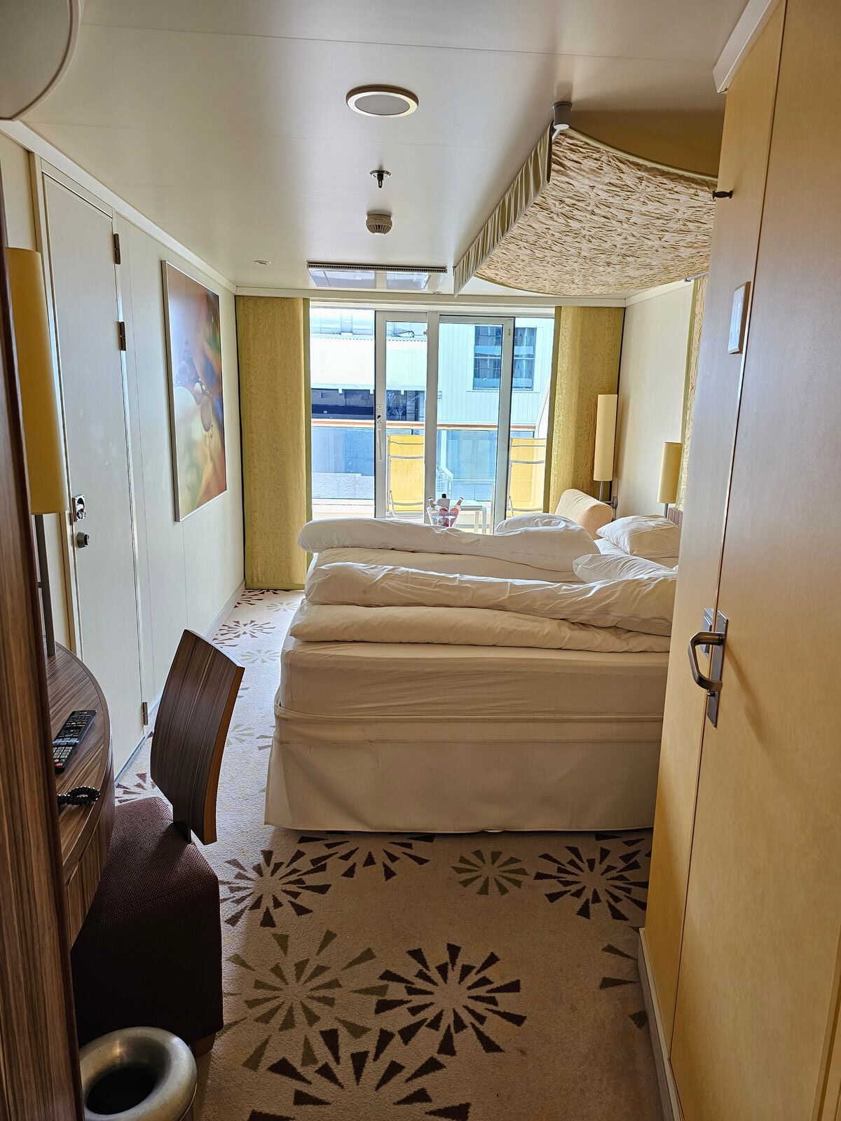 Großer Balkon, da doppelt so tief wie bei den oberen Decks. Zwischentür zur Nachbarkabine (man hört aber nix), bisschen weiter Weg bis zum Treppenhaus, aber machbar.