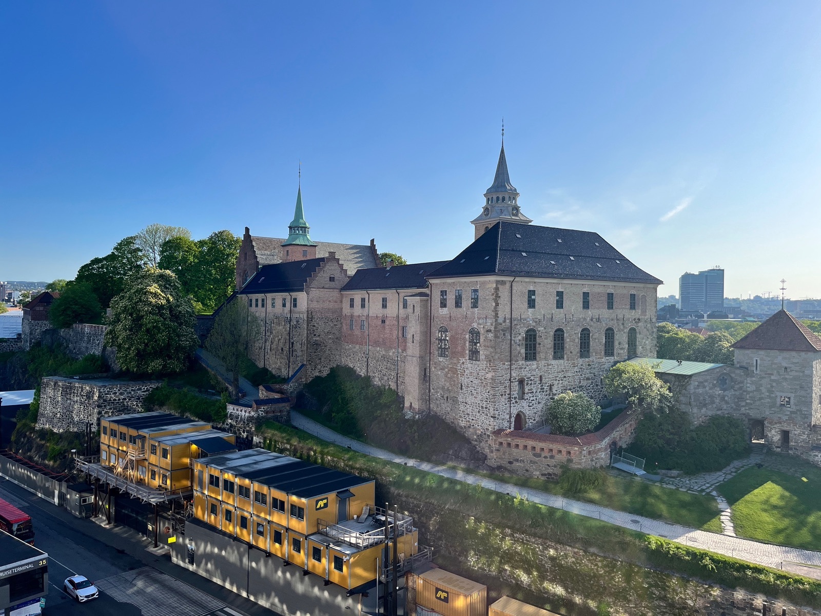 google sagt ca. 2,1 km bis Akershus. Linie 33 geht ins Zentrum.