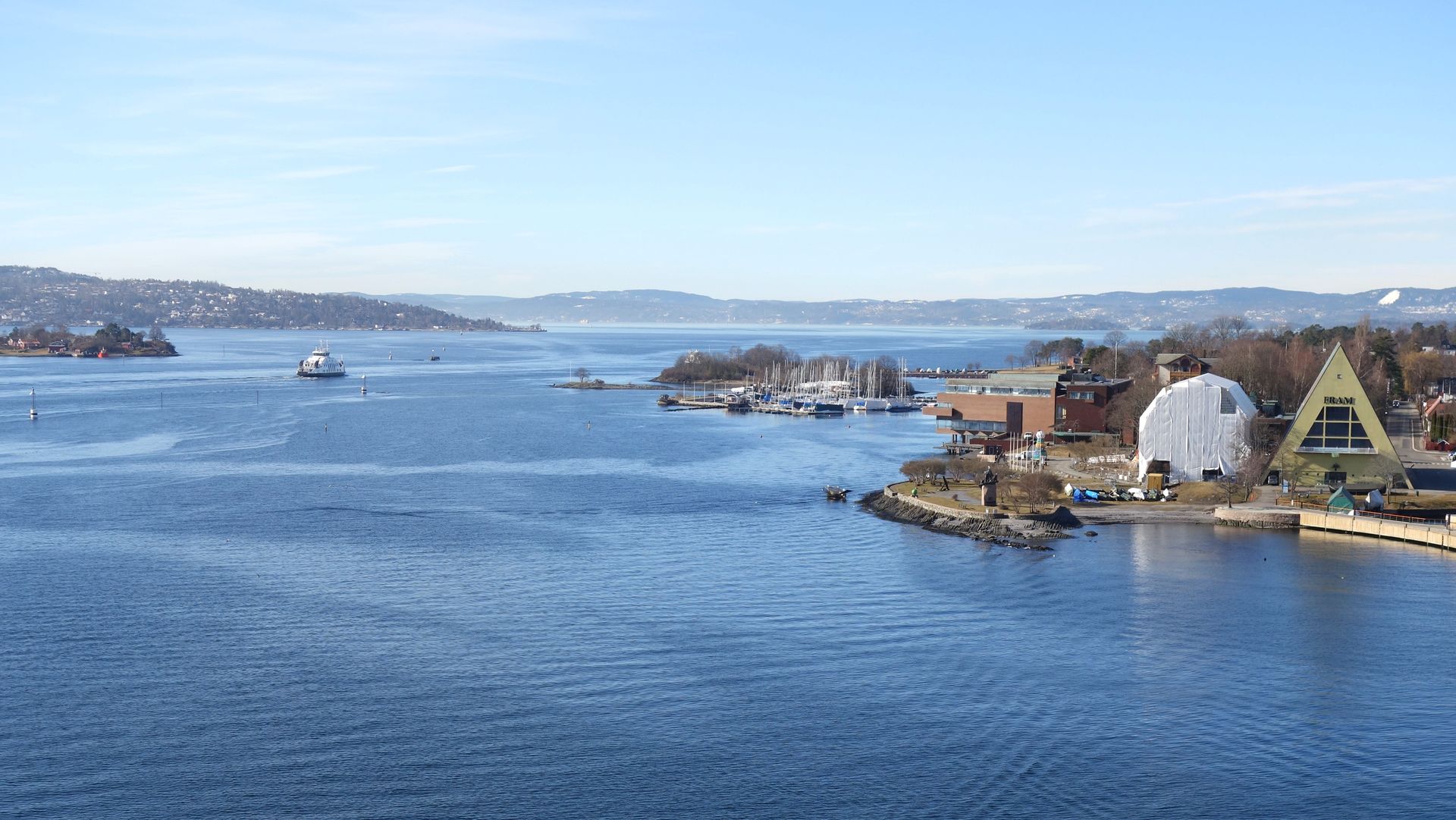 Links ist schon die Restaurant-Insel "Dyna Fyr" zu sehen, dahinter schält sich die Kulisse von Oslo aus dem Morgendunst.