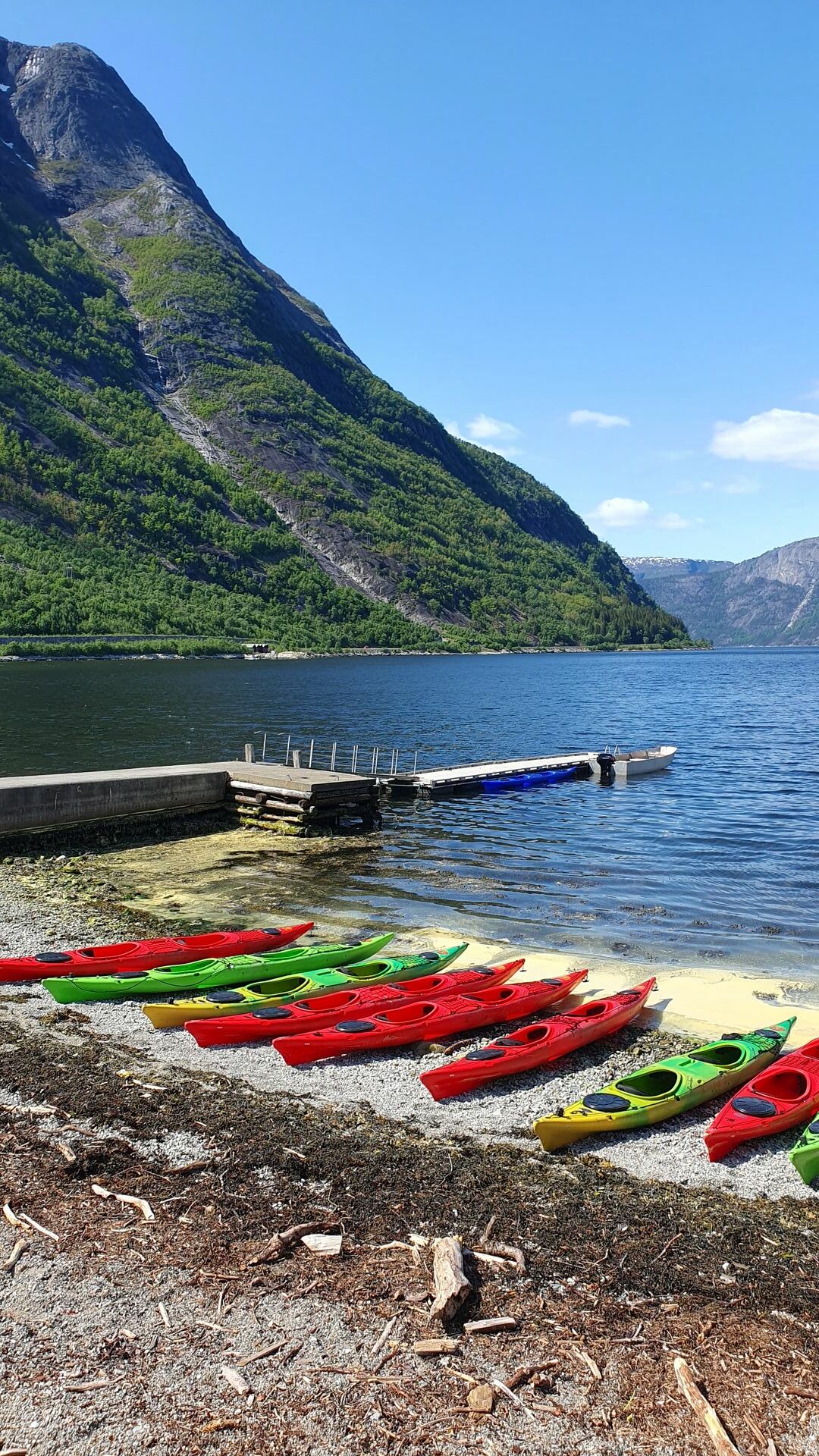 Am Nachmittag haben wir bereits von zu Hause aus über https://www.fjordtours.com/de/aktivitaete…rd-in-eidfjord/ für 61 Euro pro Person eine Kajaktour auf dem Eidfjord gebucht. Zu Fuß war die Kajakstation am Supermarkt "Joker" nur 200 Meter vom Liegeplatz entfernt. Zunächst gab es Rettungswesten und einen praktischen Spritzschutz sowie die Paddel. Der Ausflugsanbieter ist der Selbe, über den auch AIDA die angebotene Kajaktour bucht. Wir waren insgesamt zwei Pärchen, die den Ausflug individuell gebucht hatten mit einem eigenen Guide, während auf dem quasi parallel startenden AIDA Ausflug ungefähr 30 Leute auf einen Guide kamen. Wir fuhren in 2-er Kajaks vorbei an AIDAperla in den wunderschönen Fjord und anschließend an einen Strand, der uns an Südostasien erinnerte.