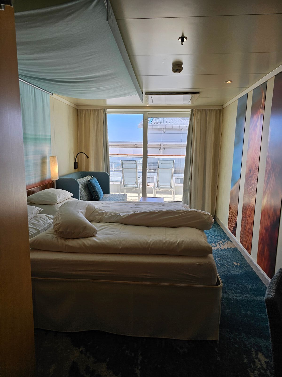Die Kabine ist groß und auf Deck 6 sind auch die größten Balkone, aber nur teilweise überdacht.