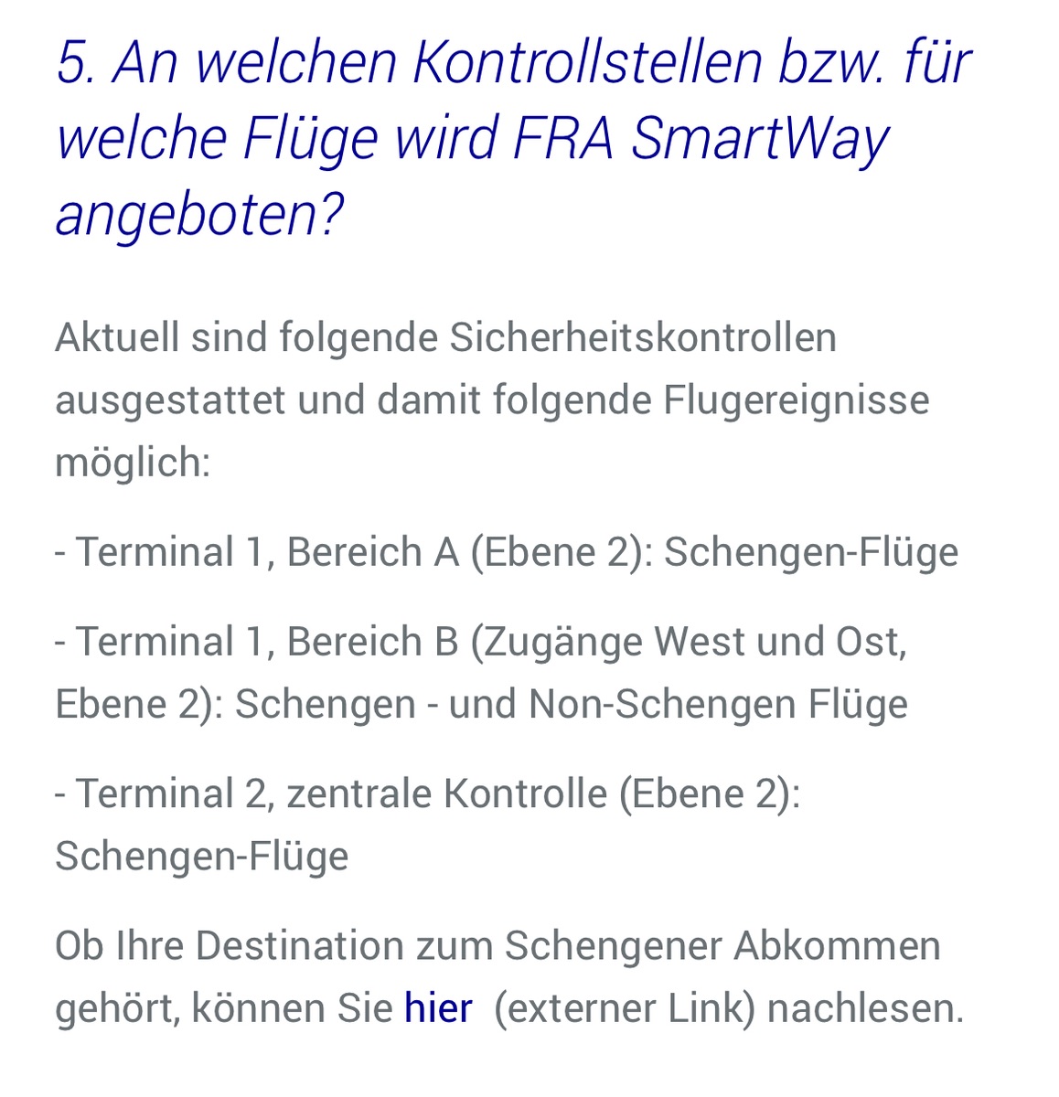 Also wir sind in den letzten Jahren x mal ab Frankfurt in die ganze Welt geflogen und haben noch nie lange an der Sicherheitskontrolle warten müssen . Viel schlimmer sind immer die ellenlangen Schlangen am Check in Schalter . Ich wüsste auch garnicht , welches zeitfenster ich da für den Smart way buchen sollte , ich weiß ja nicht , wann ich mit dem Check in fertig bin .