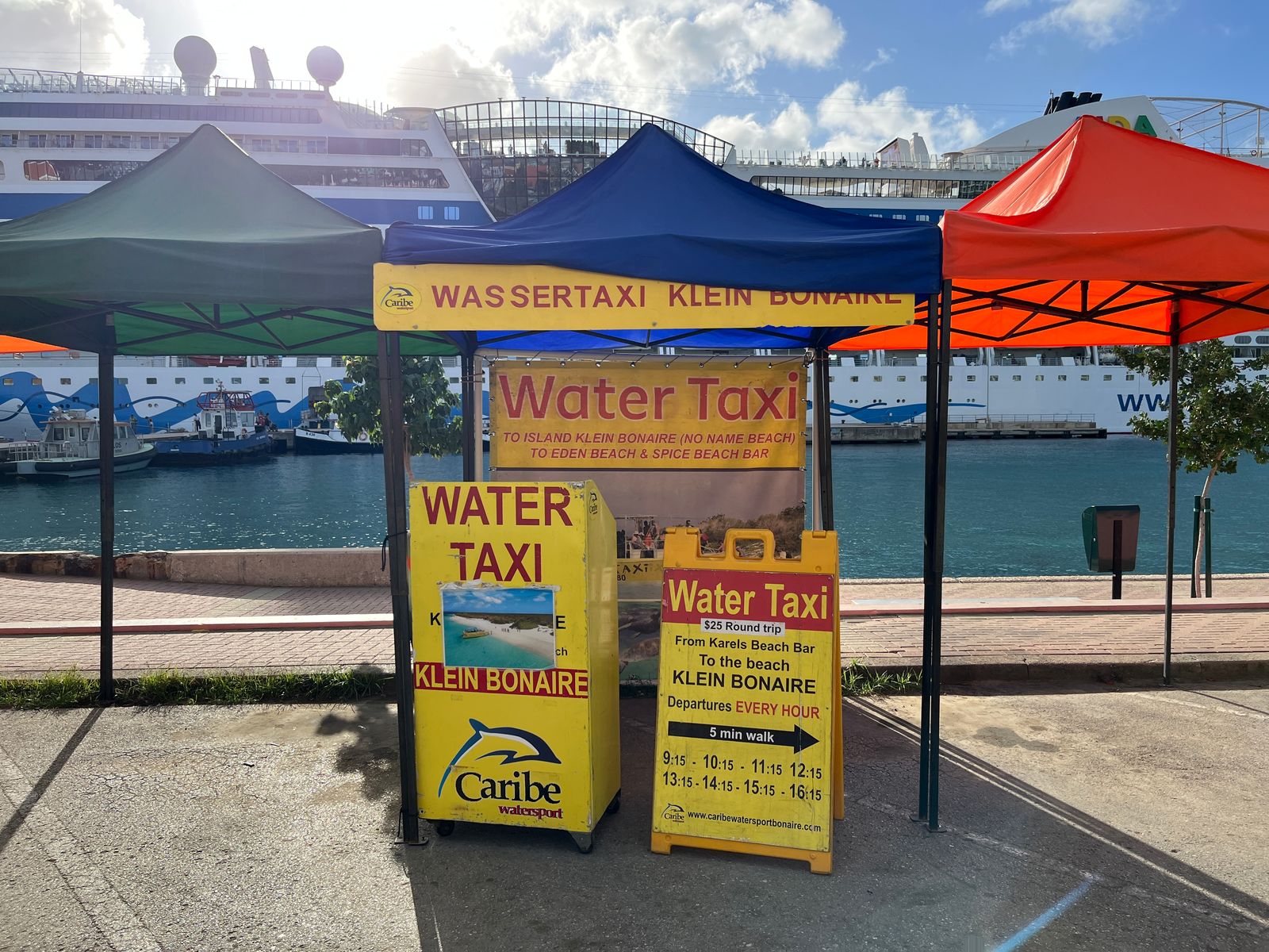 Wir haben das von "Caribe" genutzt - das fährt direkt an Karel's Beach Bar ab, und die hatten einen Stand direkt vor dem Schiff und haben die Passagiere gleich "abgefangen";).