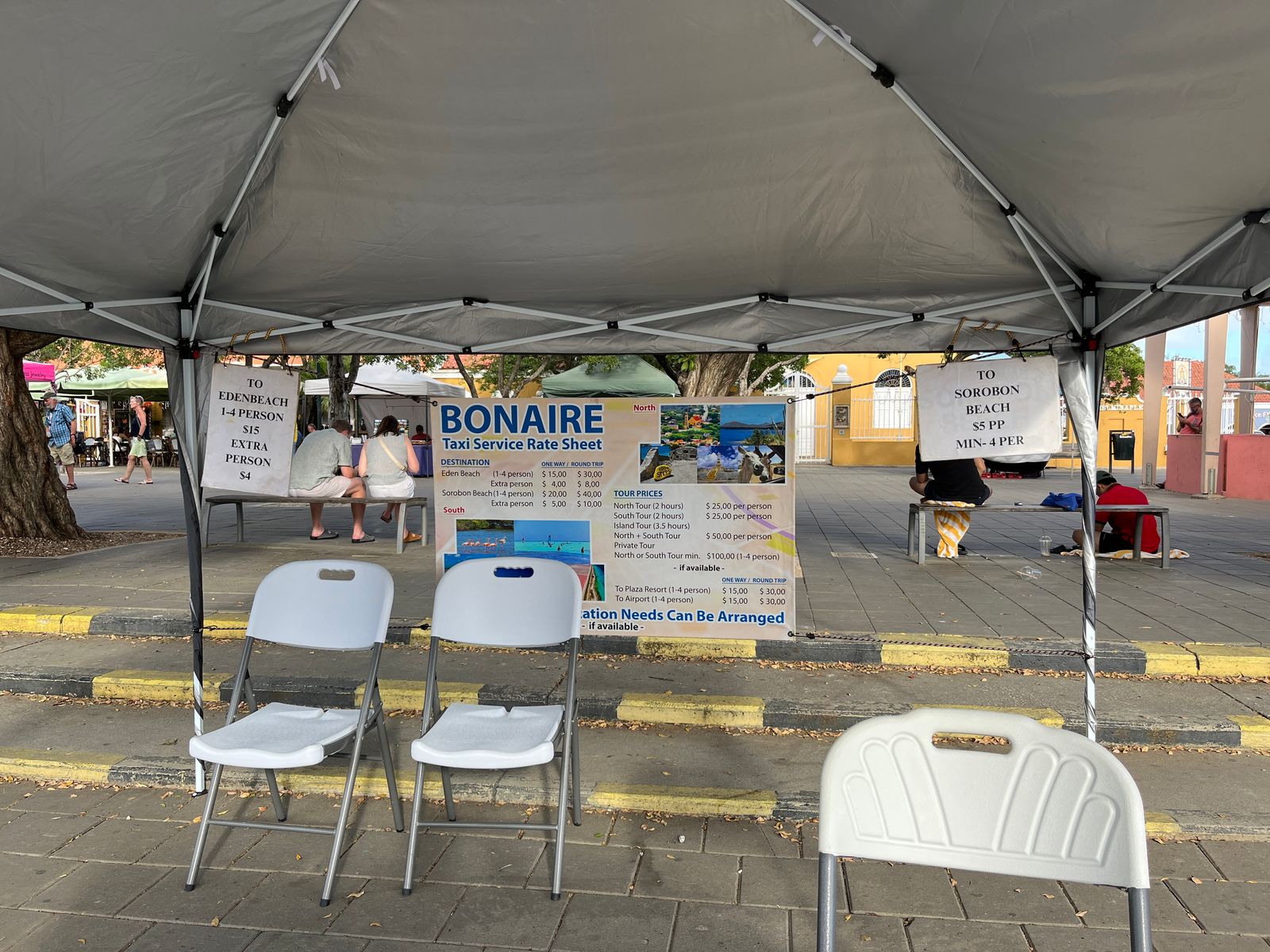 Wir haben das von "Caribe" genutzt - das fährt direkt an Karel's Beach Bar ab, und die hatten einen Stand direkt vor dem Schiff und haben die Passagiere gleich "abgefangen";).