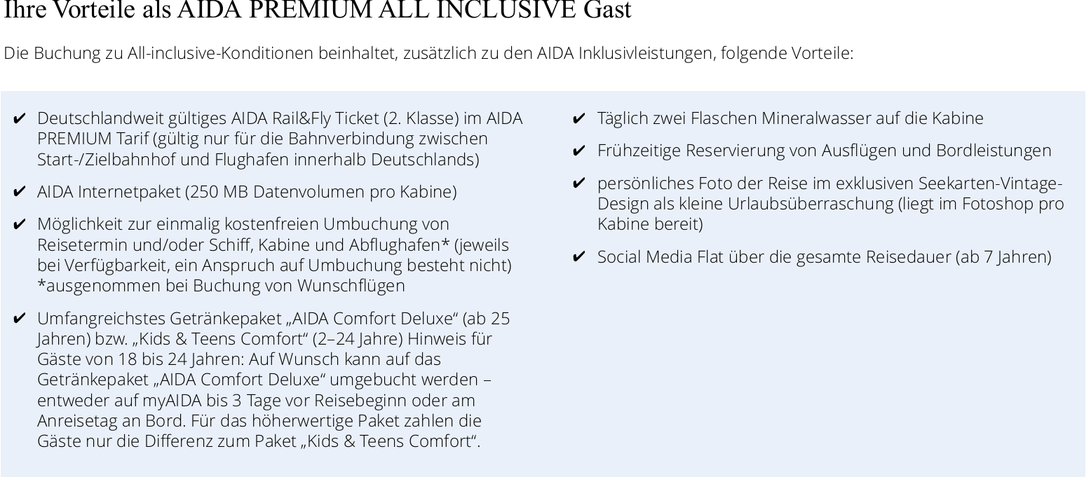Kurze Frag in die Runde, ich habe für meine Mallorca Reise im Mai 2024 mit der Bella Premium All-Inn ohne Flug gebucht. Bekomme ich trotzdem den Rail&Fly Code von Aida wie in der Buchungsbestätigung aufgeführt oder ist das an einen über AiDA gebuchten Flug gekoppelt?