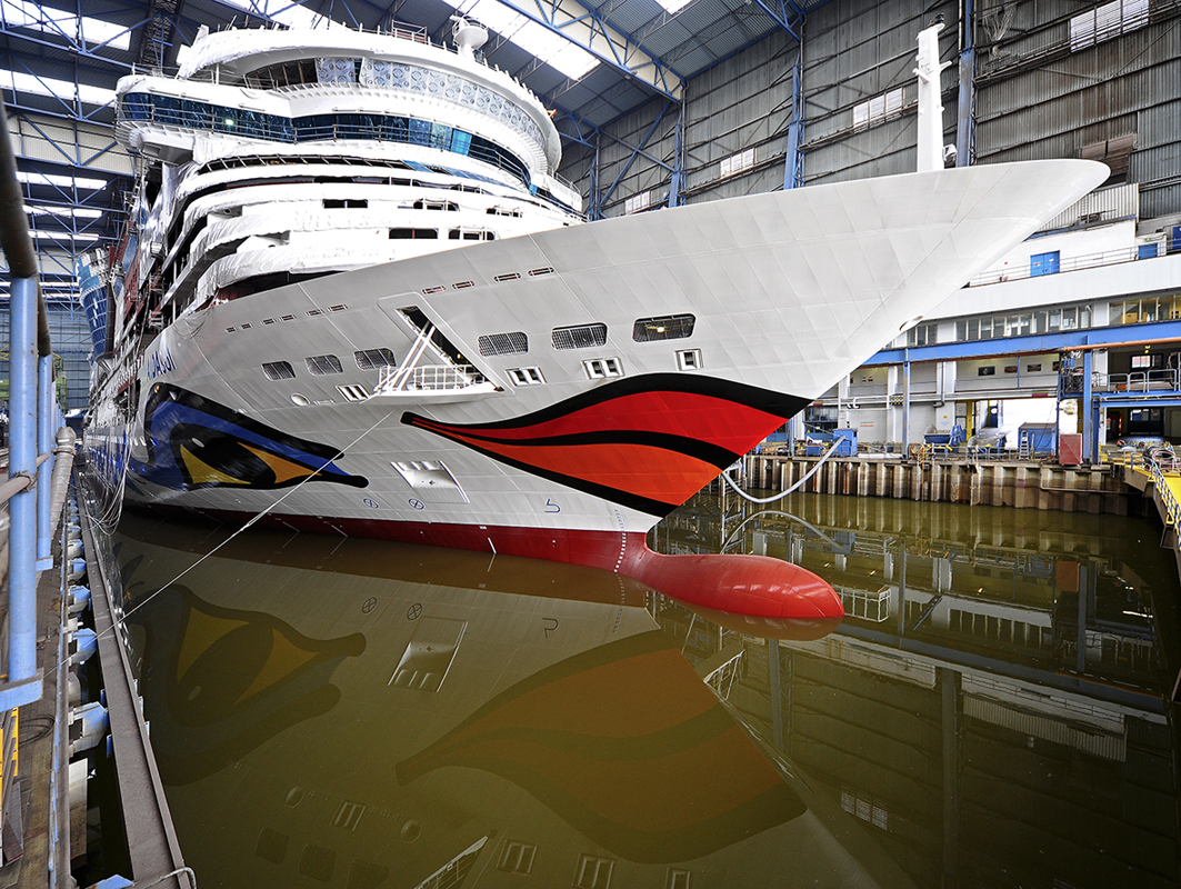 Nach etwa 9 Monaten Bauzeit auf der Meyer Werft in Papenburg hat das neue Clubschiff AIDAsol zum ersten Mal Wasser unter den Kiel bekommen. Zum Aufschwimmen des jüngsten AIDA Zuwachses wurde das Trockendock per Knopfdruck mit Wasser geflutet. Bevor das neue AIDA Schiff erstmals im Baudock schwamm, überprüfte das Neubauteam der Werft, ob alle Montageöffnungen am Schiffsrumpf komplett verschweißt und geschlossen sind.