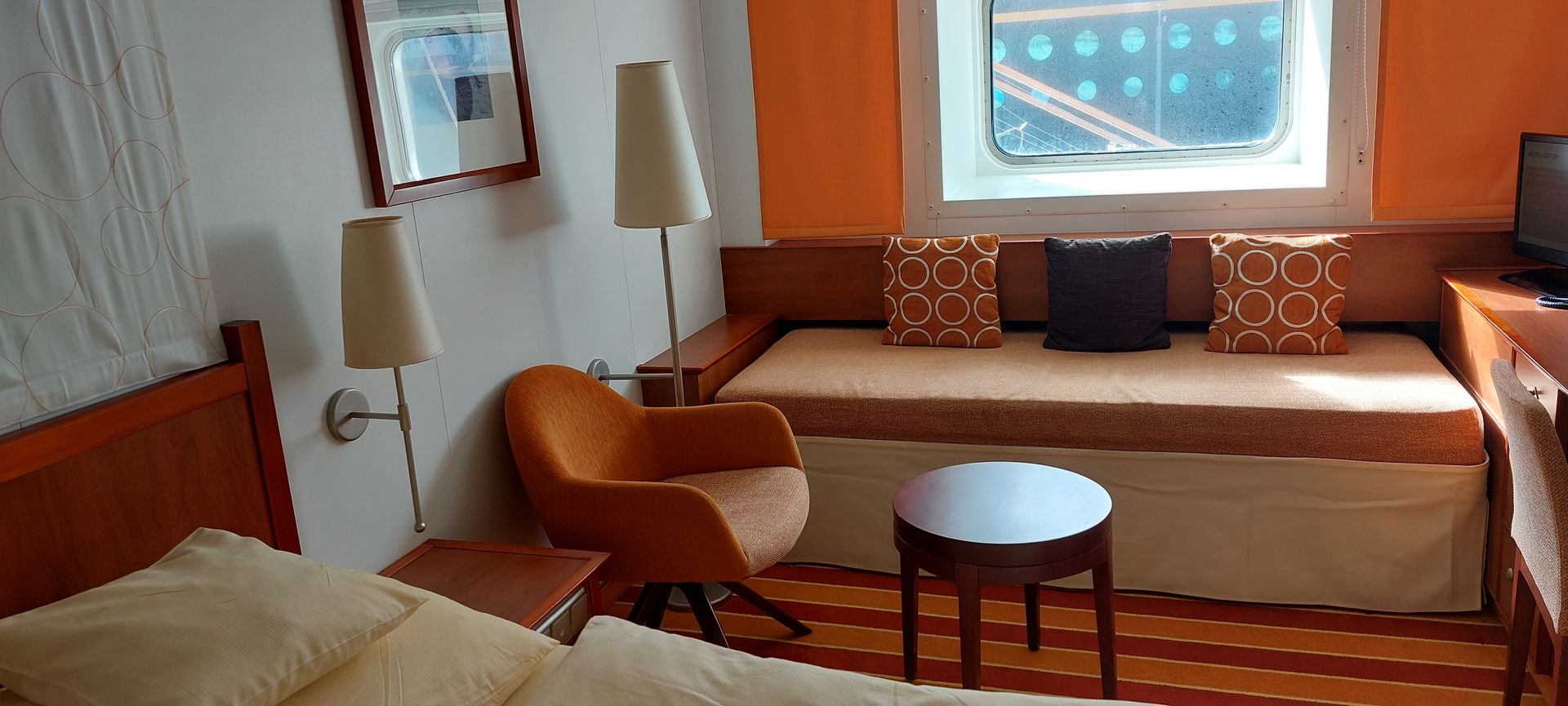 Sehr schöne große Kabine mit viel Stauraum. Ein Doppelbett und ein Sofa unterm Fenster das ebenfalls als Bett benutzt werden kann. Die Kabine liegt nah an den Aufzügen und der Wasserstation. Wir haben uns sehr wohl gefühlt und konnten auch keine störenden Geräusche feststellen. Zusammengefasst eine sehr gemütliche schöne Kabine für einen tollen Urlaub.