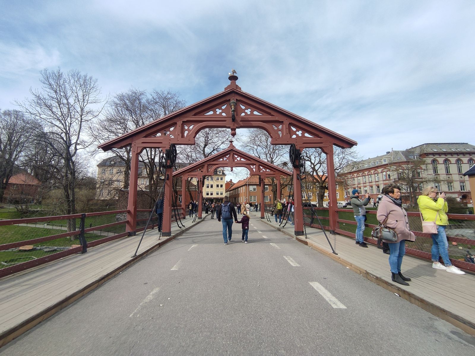 Nach der Brücke direkt links durch den älteren Stadtteil Bakklandet mit schönen Holzhäusern gehen bis zur nächste Brücke über den Nidelva.