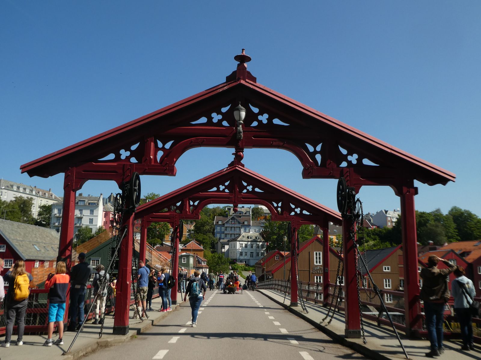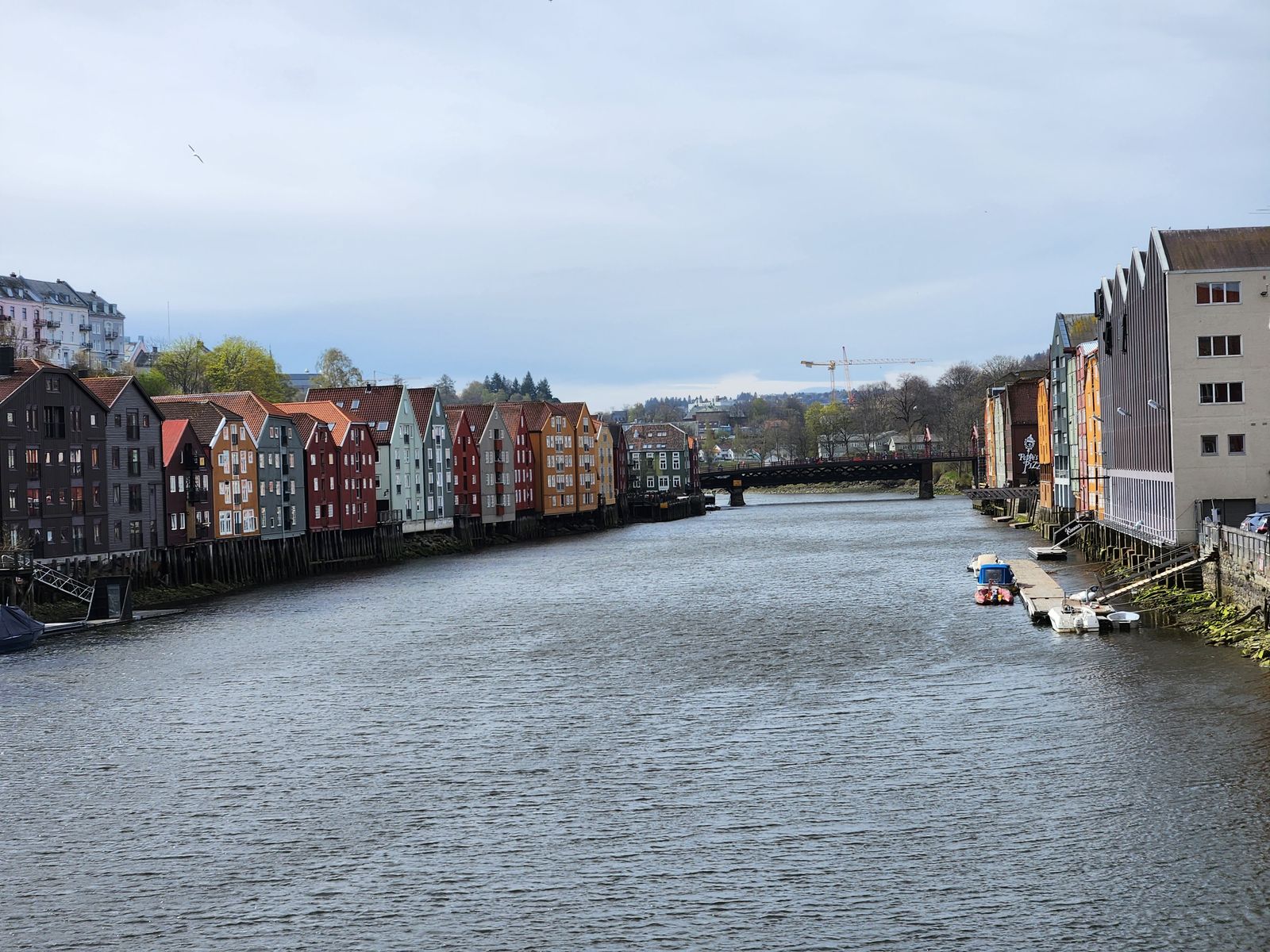 Nach der Brücke direkt links durch den älteren Stadtteil Bakklandet mit schönen Holzhäusern gehen bis zur nächste Brücke über den Nidelva.