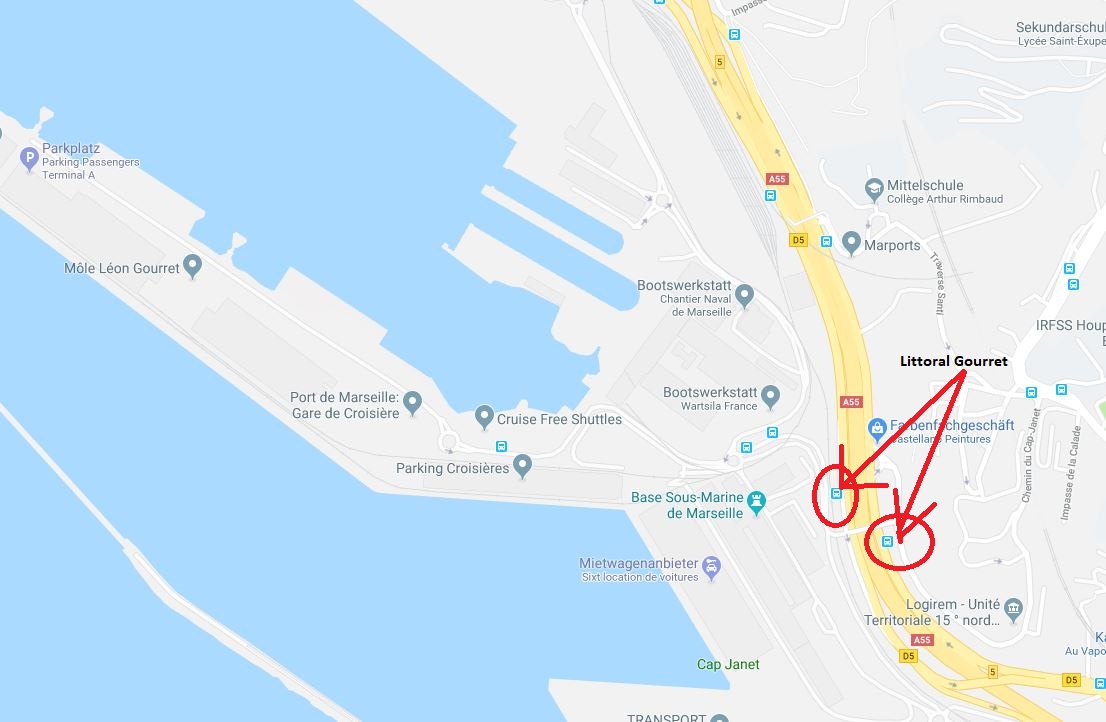 Der kostenpflichtige COSTA- Shuttlebus fährt ab dem Kreuzfahrtterminal direkt zum Alten Hafen, und zwar ungefähr dorthin, wo auch die Bimmelbahn losfährt. Der kostenlose Shuttle- Bus fährt ab dem Hafenausgang (etwa ein Kilometer entfernt vom Schiff) nach Joliette. Dieser Bus fährt jedoch nicht täglich. Täglich fährt jedoch die Buslinie 35 ab etwa dem Hafenausgang nach Joliette. Ist offensichtlich eine neue Haltestelle. Normalerweise hält der Bus nämlich nur oben auf der Landstraße (siehe 2. Bild). Das ist die Haltestelle Littoral Gourret (wichtig für die Rückfahrt, damit Du nicht zu früh oder zu spät aussteigst). Ab Joliette am besten zu Fuß durch die schöne Rue de la Republique zum Alten Hafen.