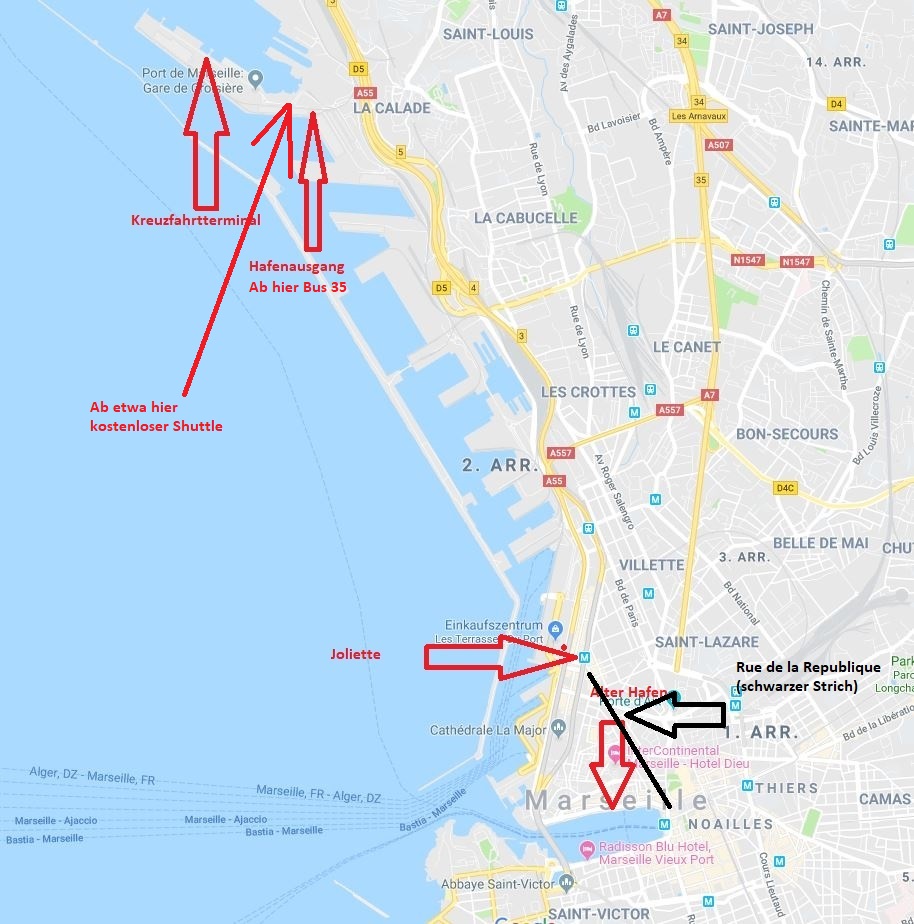 Der kostenpflichtige COSTA- Shuttlebus fährt ab dem Kreuzfahrtterminal direkt zum Alten Hafen, und zwar ungefähr dorthin, wo auch die Bimmelbahn losfährt. Der kostenlose Shuttle- Bus fährt ab dem Hafenausgang (etwa ein Kilometer entfernt vom Schiff) nach Joliette. Dieser Bus fährt jedoch nicht täglich. Täglich fährt jedoch die Buslinie 35 ab etwa dem Hafenausgang nach Joliette. Ist offensichtlich eine neue Haltestelle. Normalerweise hält der Bus nämlich nur oben auf der Landstraße (siehe 2. Bild). Das ist die Haltestelle Littoral Gourret (wichtig für die Rückfahrt, damit Du nicht zu früh oder zu spät aussteigst). Ab Joliette am besten zu Fuß durch die schöne Rue de la Republique zum Alten Hafen.