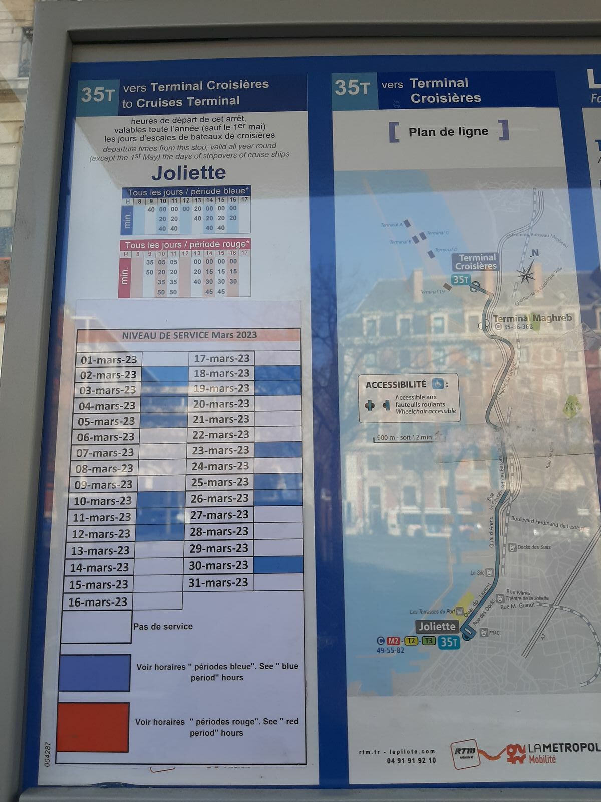 Wir sind dann noch ein kleines Stück weiter entlang der grünen Linie gegangen und kamen dann zur Haltestelle der Linie 35T. Dies ist eine Linie, die (ohne Zwischenhalte) zwischen Terminal Croisières und Juliette im 20-Minuten-Takt (mit kleiner Mittagspause / siehe Fahrplan) pendelt. Das Ticket (€ 2) konnte man in bar beim Fahrer (Kleingeld!) kaufen und im Bus entwerten. An der Haltestelle hing auch ein Plan, an welchen Tagen dieser Bus im März 2023 fährt. Wie es im restlichen Jahr aussieht, stand da leider nicht.