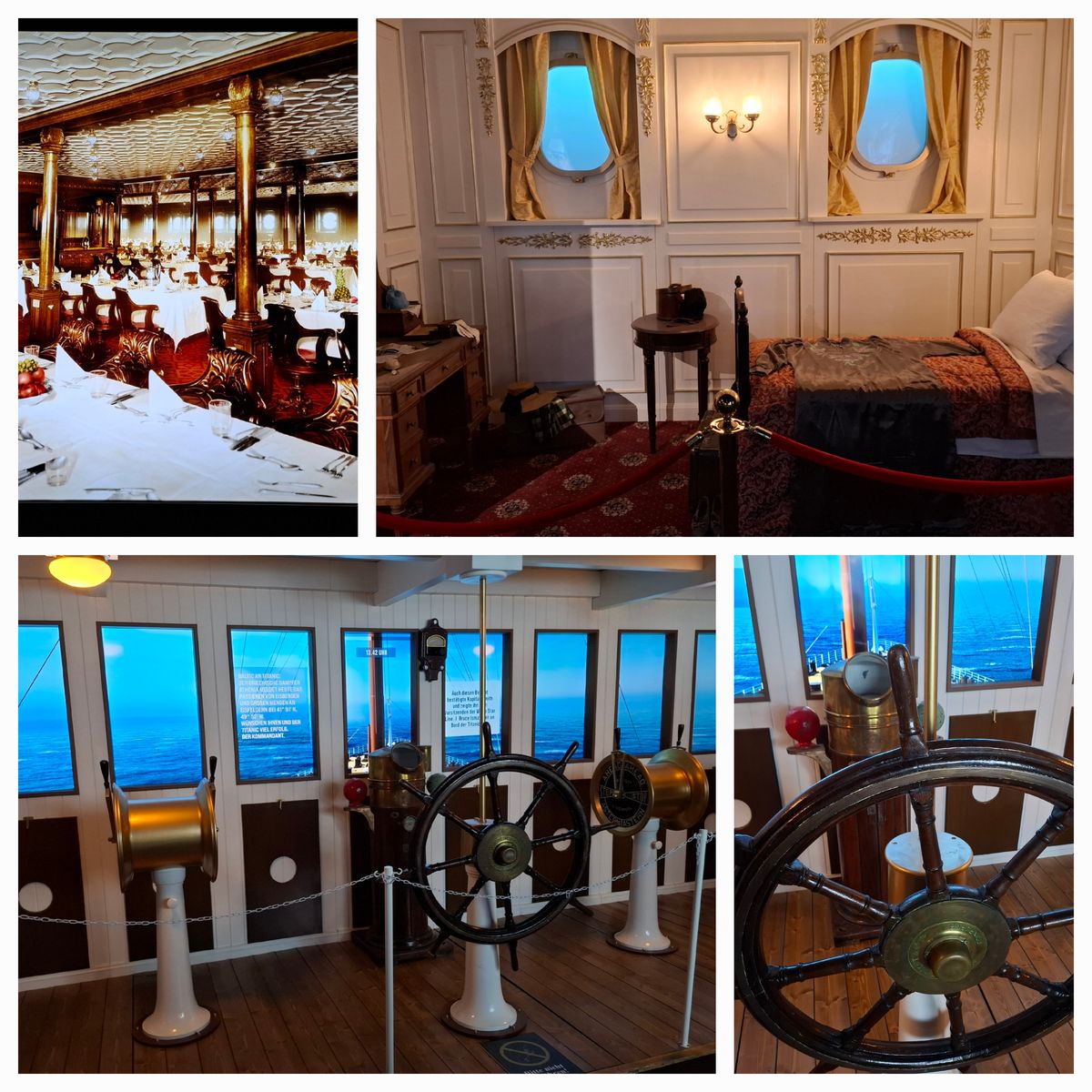 Neben Original-Artefakten der Titanic werden auch Gegenstände der Schwesterschiffe Olympic und Britannic ausgestellt. Sehr viele Schautafeln, alle auf deutsch verfasst, informieren den Besucher über das Bordleben und die Technik des Schiffes. Sehr gut gemacht ist auch der kostenlose Audioguide, den man per QR-Code auf dem Handy abspielt. Es ist keine App sondern ein Link zu einer HP. Die Audiodateien kann ich noch daheim anhören. Also QR-Code speichern.. An gewissen Orten sind Nummern mit einem Handysymbol instaliert. Man sucht dann aus dem Menü die entsprechende Audiodatei heraus und wird sehr ausführlich informiert. Wir haben unsere Ohrhörer eingesetzt, damit wir andere Besucher nicht stören.