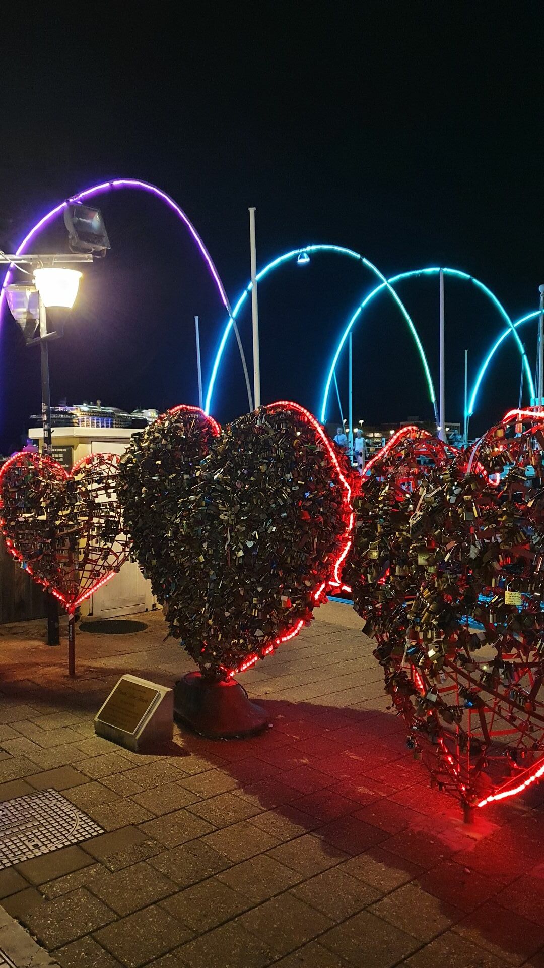 Abends schlenderten wir noch zu Fuß durch die Stadt und über die Queen Emma Brücke. Dort setzten wir uns an eine Bar direkt am Wasser und bewunderten die beleuchtete Brücke. Zu guter Letzt brachten wir noch ein rotes graviertes Herzschloss mit unseren Initialen, dem Datum 06.03.2022 und dem #aidaperlamomente an einem der dafür vorgesehenen großen Herzen an, welches ich meiner Freundin zum Valentinstag geschenkt hatte. (Wer es zufällig bei einem Besuch in Curacao entdeckt, kann mir gerne ein Bild davon schicken)