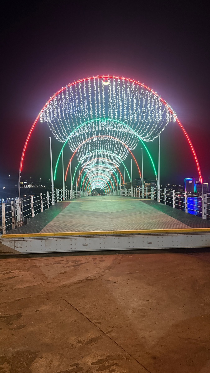 Die Beleuchtung ist immer abends! Als wir dort waren, waren Polizei Einheiten auf beiden Seiten der Brücke, ist ein beliebter Ort für Diebstahl! Deshalb positionieren sich Beamte mit Funkverbindung an beiden Aufgängen! Mit Fahrrad teilweise! Man sollte nur das nötigste bei sich haben