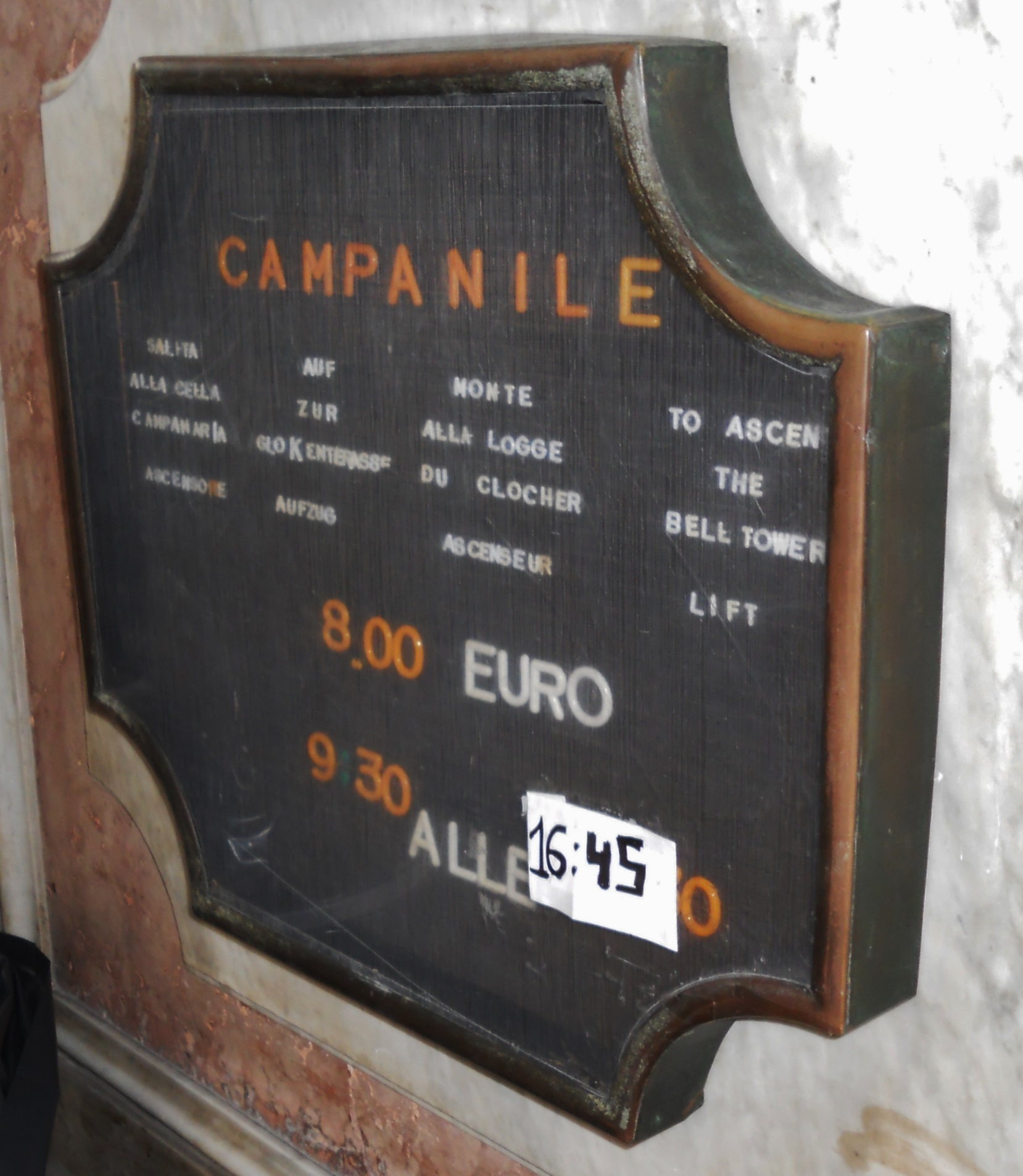 Gewusst habe ich es nicht, habe aber gerade mal im Internet nachgeschaut. Der Campanile öffnet täglich um 09:45 Uhr und schließt um 19:00 Uhr.