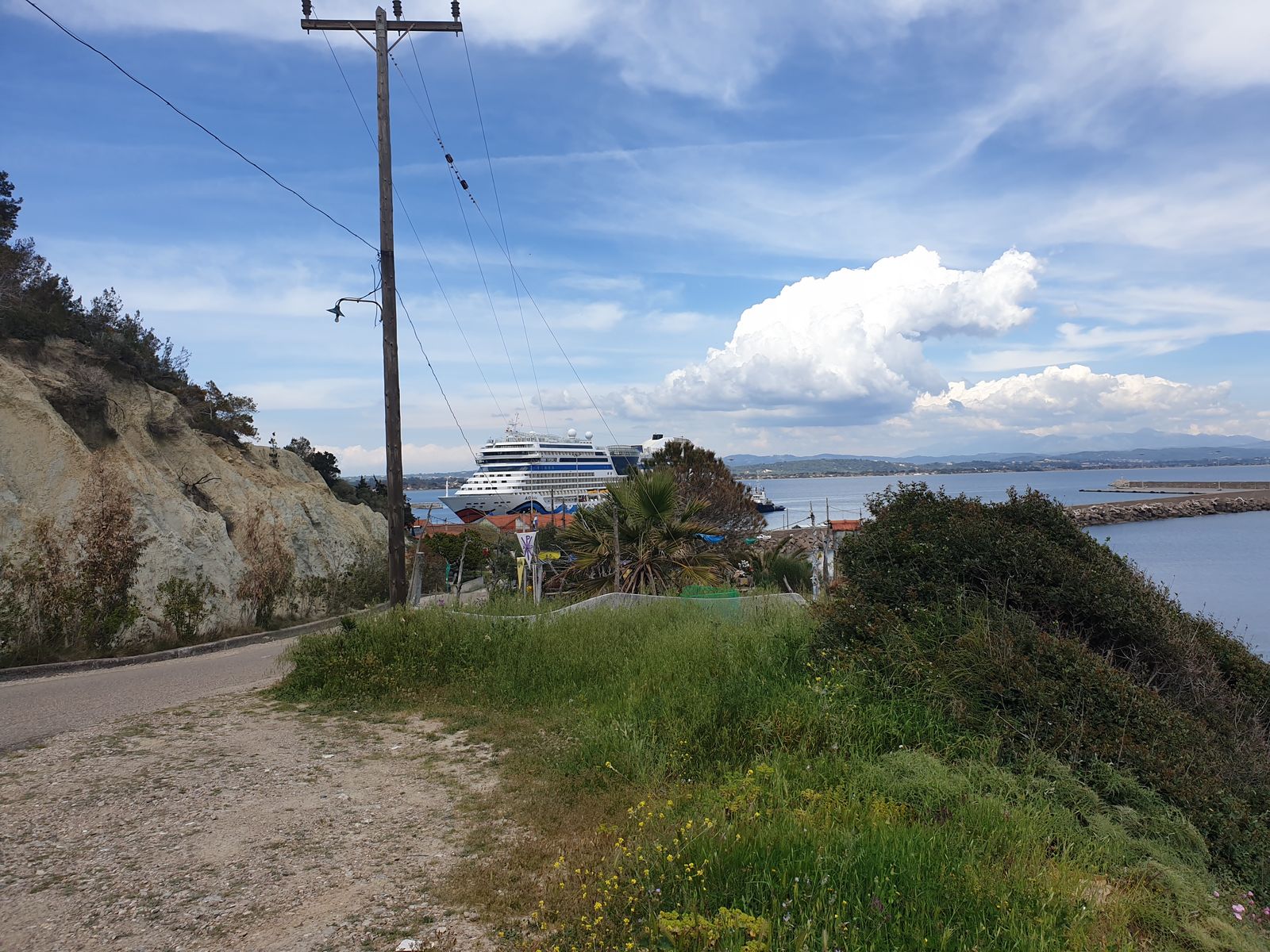 Und wenn man den Hügel hinaufwandert, kommt man zu einem Restaurant mit einem unbeschreiblich tollen Blick auf Meer, Schiff und Ort.