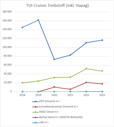 TUI ist dazu übergegengen die Zahlen für die Marken Mein Schiff und Hapag Lloyd zusammenzufassen. Dadurch ist der Vergleich mit den Vorjahren etwas schwieriger geworden. Zu Hapag Lloyd findet man aktuell nichts mehr. Ich hatte aber mal Zahlen für die von 2018 bis 2021 mir vermerkt, womit man wenigstens grob schätzen kann. Vor Corona hat Hapag Lloyd mit einem etwas anderen Flottenmix (2019: Bremen statt Spirit, Nature erst ab April und Inspiration erst ab Okt (also netto 4 Schiffe statt 5 heute)) etwa 36.000 Tonnen Treibstoff verbraucht. Weil sie seit Corona auf 100% MGO umgestiegen sind und kein Schweröl mehr nutzen wird ein Großteil des von der Gruppe verbrauchten Schiffsdiesels von Hapag Lloyd verbraucht worden sein. Bei mitlerweile 5 Schiffen statt vorher netto 4 würde ich mal von mindestens 40.000 t ausgehen.