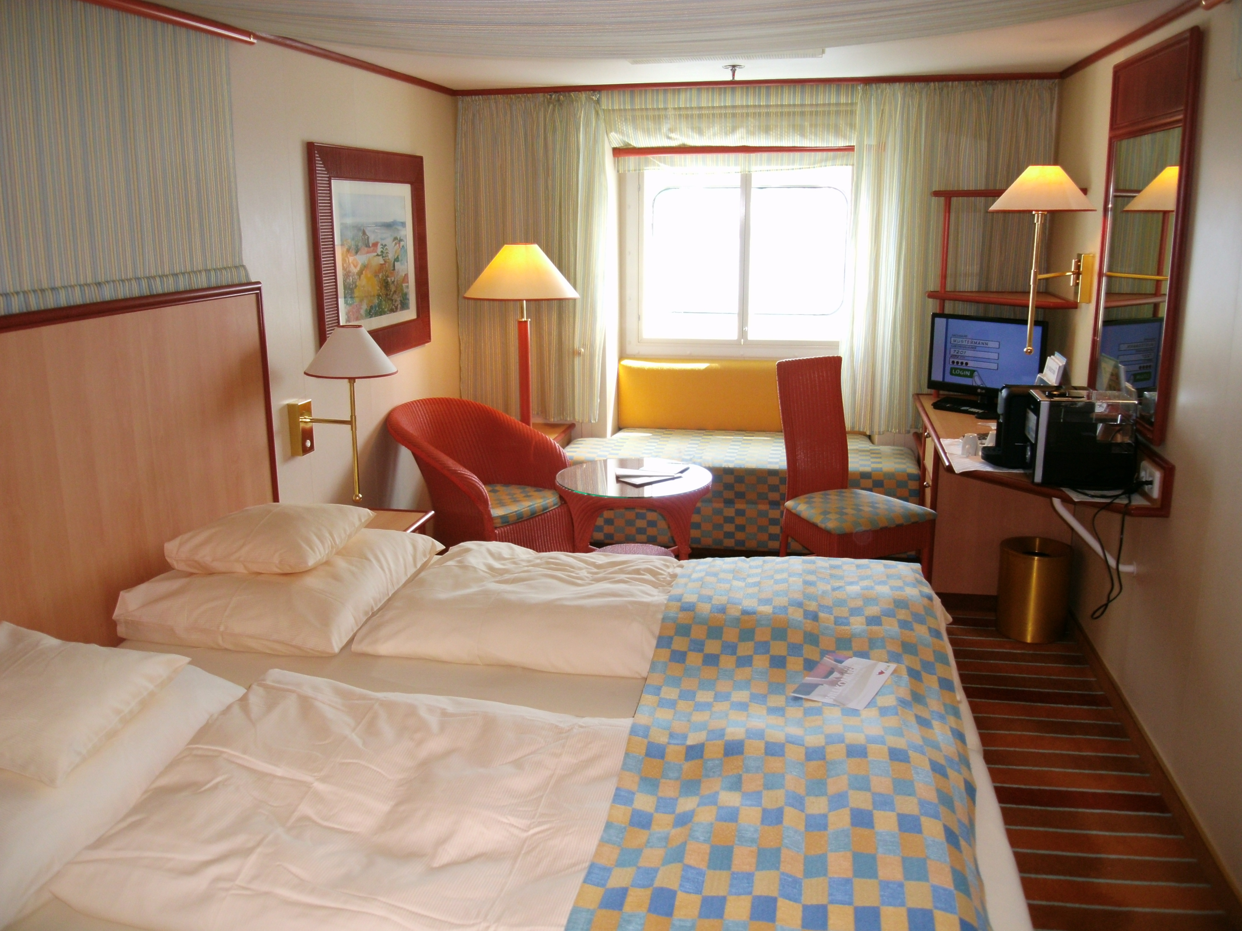 es handelt sich um eine Außenkabine mit einem normalen Fenster und Doppelbett. Vor dem Fenster ist noch ein kleines Sofa, welches ggf. als drittes Bett fungieren kann. Dann ist es allerdings schon sehr eng. Die Kabine an sich ist sehr schön.