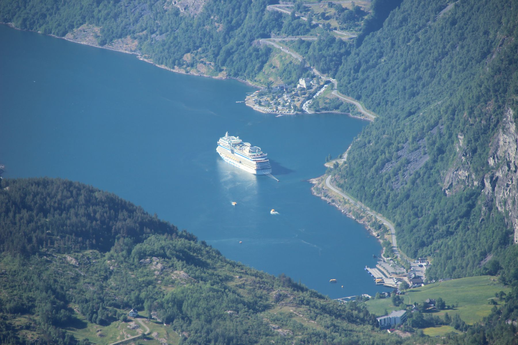 Um 20:00 Uhr liegt der Fjord aufgrund seiner Enge bis auf die Bergspitzen im Schatten. Vorausgesetzt ihr habt schönes Wetter, dann habt ihr über Mittag eindeutig das tollere Erlebnis einschließlich der Beleuchtung auf die sieben Schwestern, die aber Ende August aufgrund von Wassermangel wohl nur zu dritt oder zu viert zu sehen sind. Wenn ihr mit dem Wetter Pech haben solltet, dann hängen die Wolken tief auf halber Höhe und es gibt keine schöne Sicht. Aber für eine Überlandfahrt braucht ihr auch schönes Wetter. Ich bin ca. 20mal in Geiranger gewesen, davon 8mal mit AIDA, immer mit schönem Wetter, klassischer Musik von Grieg und einem Lektor. Es war jedes Mal ein grandioses Erlebnis und nicht mit der Rückfahrt vergleichbar, selbst mit früheren Abfahrten im Juni/Juli nicht. Mein Tipp also: sichert euch frühzeitig einen Sitzplatz ganz vorn und genießt die Stunde Fjordcruising auf dem Geirangerfjord.