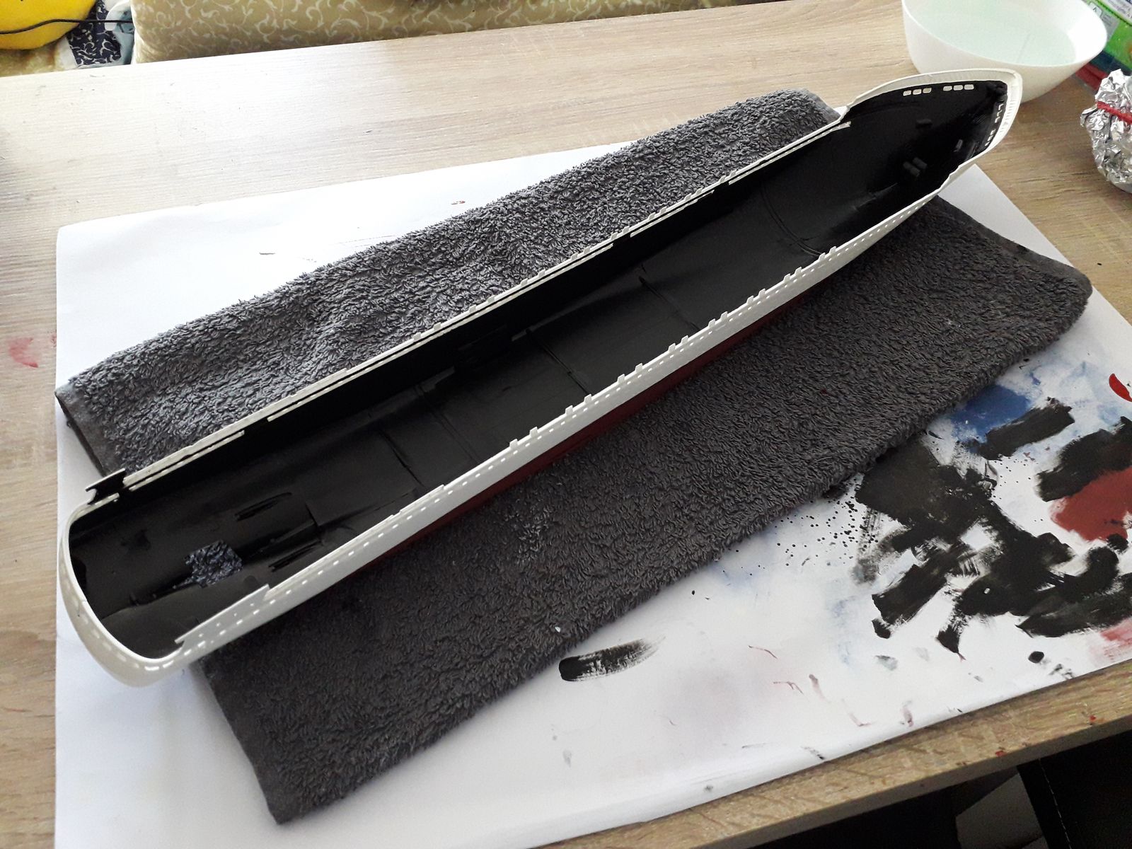 Da ich leider keine Ahnung vom Löten etc habe, aber nicht auf eine beleuchtetes Modell verzichten wollte, habe ich mir einen eigenen Plan gemacht: im Rumpf ist eine selbstklebende warmweiße Lichterkette befestigt, damit die Kabinen beleuchtet sind. Den Tipp mit dem Backpapier hatte ich aus diesem Forum, welcher wirklich hervorragend war!