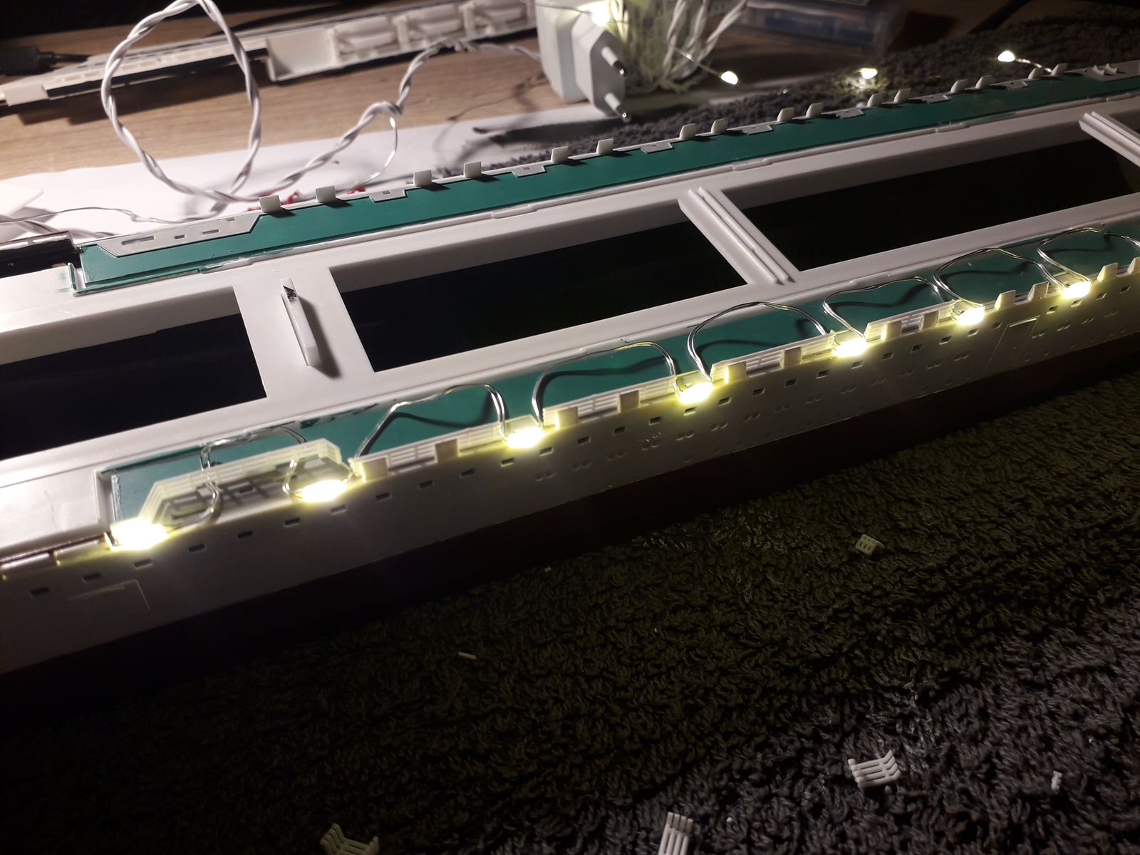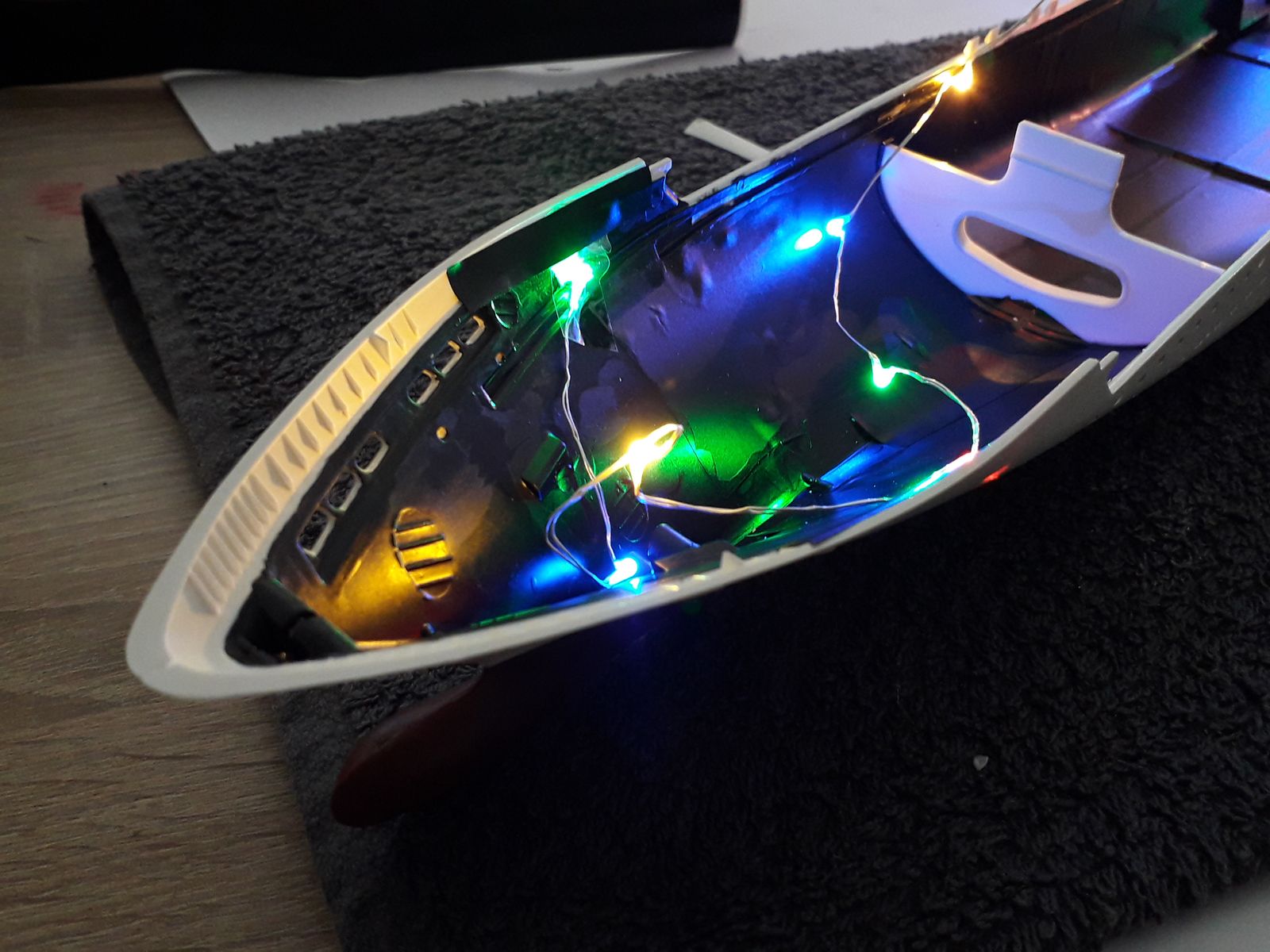 Für die Positionslichter hab ich eine bunte Lichterkette genommen und jeweils ein grünes und rotes Licht an ihrem entsprechenden Platz positioniert. Den Rest werde ich wahrscheinlich für die Beleuchtung des Pooldecks nutzen. Eine weitere weiße Lichterkette verschafft dem Schiff die Außenbeleuchtung.