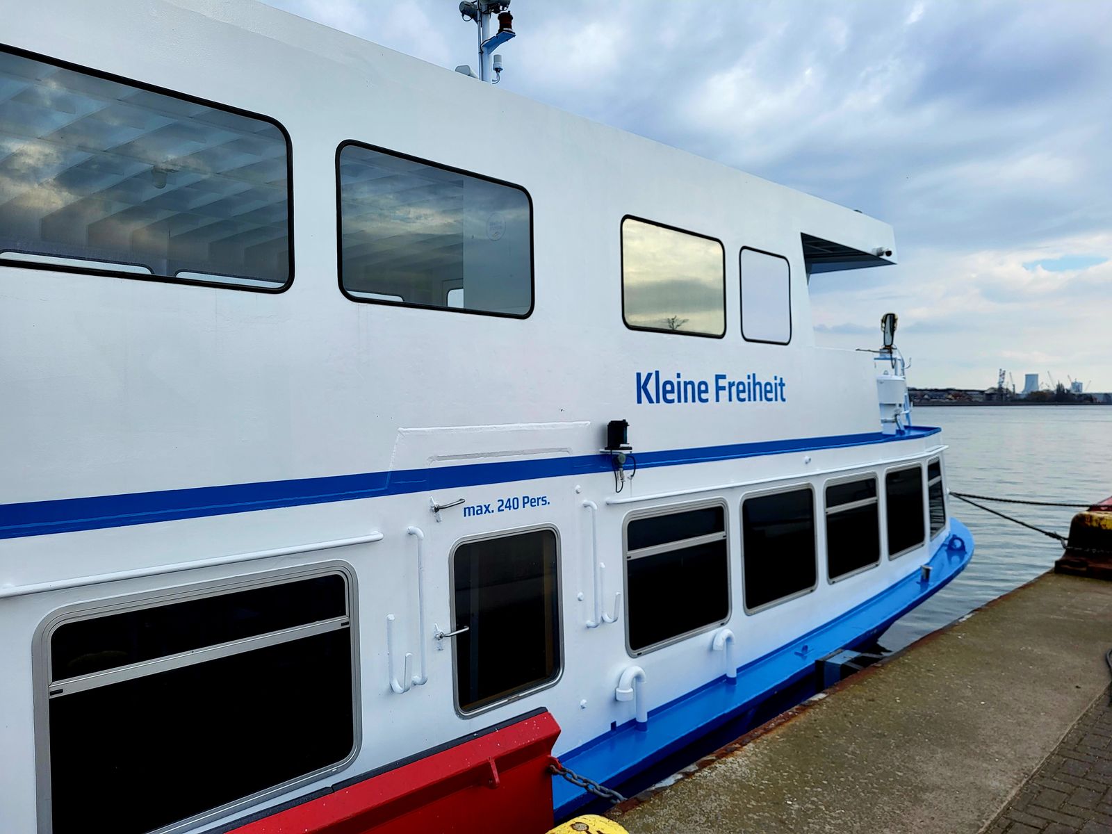 Dort finden derzeit Bauarbeiten statt, so dass kein Autoverkehr möglich ist. Für Fußgänger wird jedoch die Ersatzfähre "Kleine Freiheit" eingesetzt. Das Ganze sieht dann so aus: