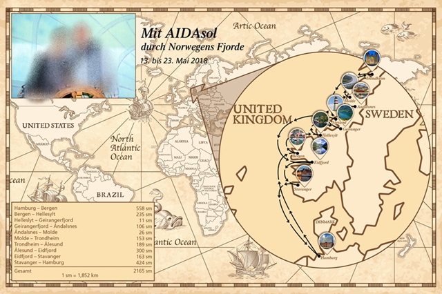 Ich hatte am ersten Tag einen Kabinenbrief mit dem Hinweis. Die Vintage Seekarte ist die Umrahmung von dem Willkommensfoto.