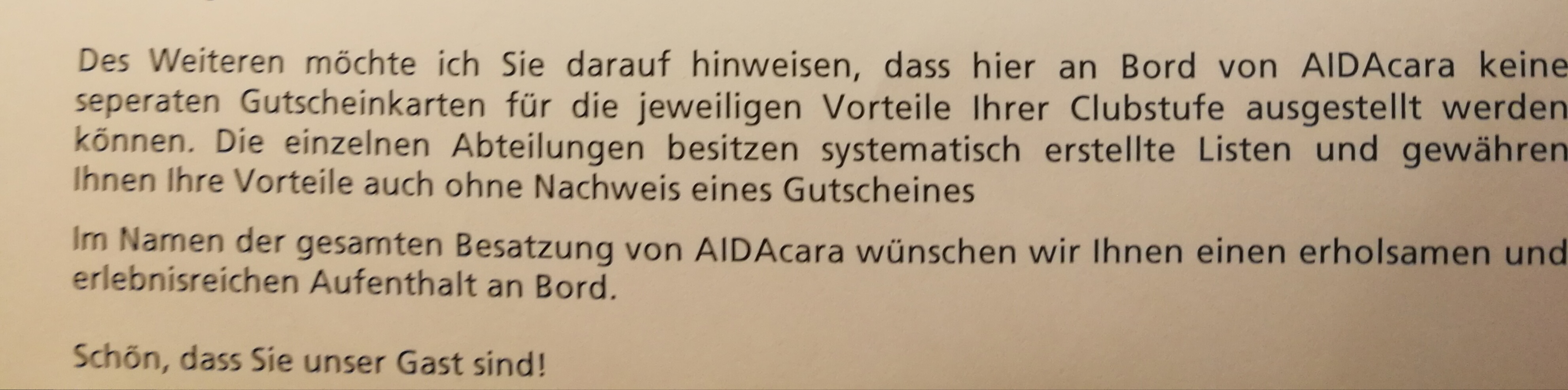 Wir hatten auf der Weihnachtsreise mit der Nova auch keinen Brief mit der Info zum Bordguthaben und am letzten Tag gab es die Gummibärchen in Kussmundform.