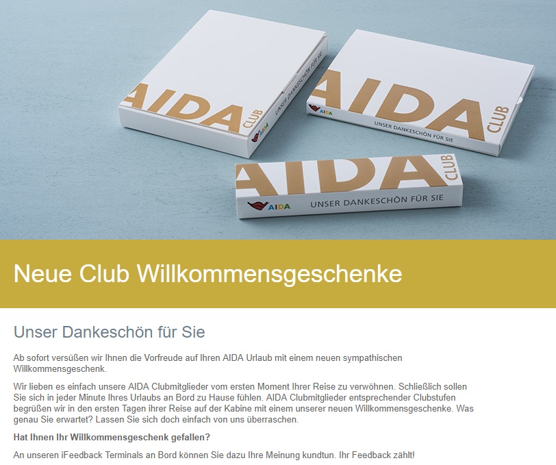 Immerhin sollen die Geschenke wohl alle 6 Monaten wechseln, damit man nicht ständig den gleichen Kram kriegt, aber das kann ich mir bei AIDA nun noch nicht wirklich vorstellen, dass das dann auch funktioniert.