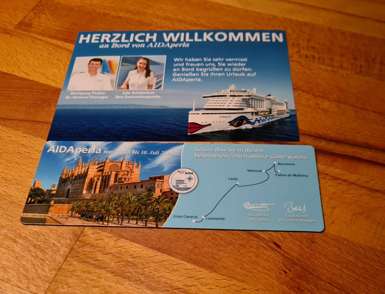 Als wir im Mai und Juli auf der Perla waren, hatte wir zur Begrüßung einmal das Foto und am Ende der Reise noch einen Magneten bekommen (den hatten wir vor Corona auch immer am Ende der Sternstunde bekommen). Fand ich nett.