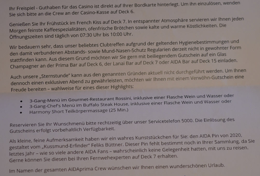 Genau, sogar die zwei Champagnersorten standen drauf, einzulösen Marbar oder Aidabar