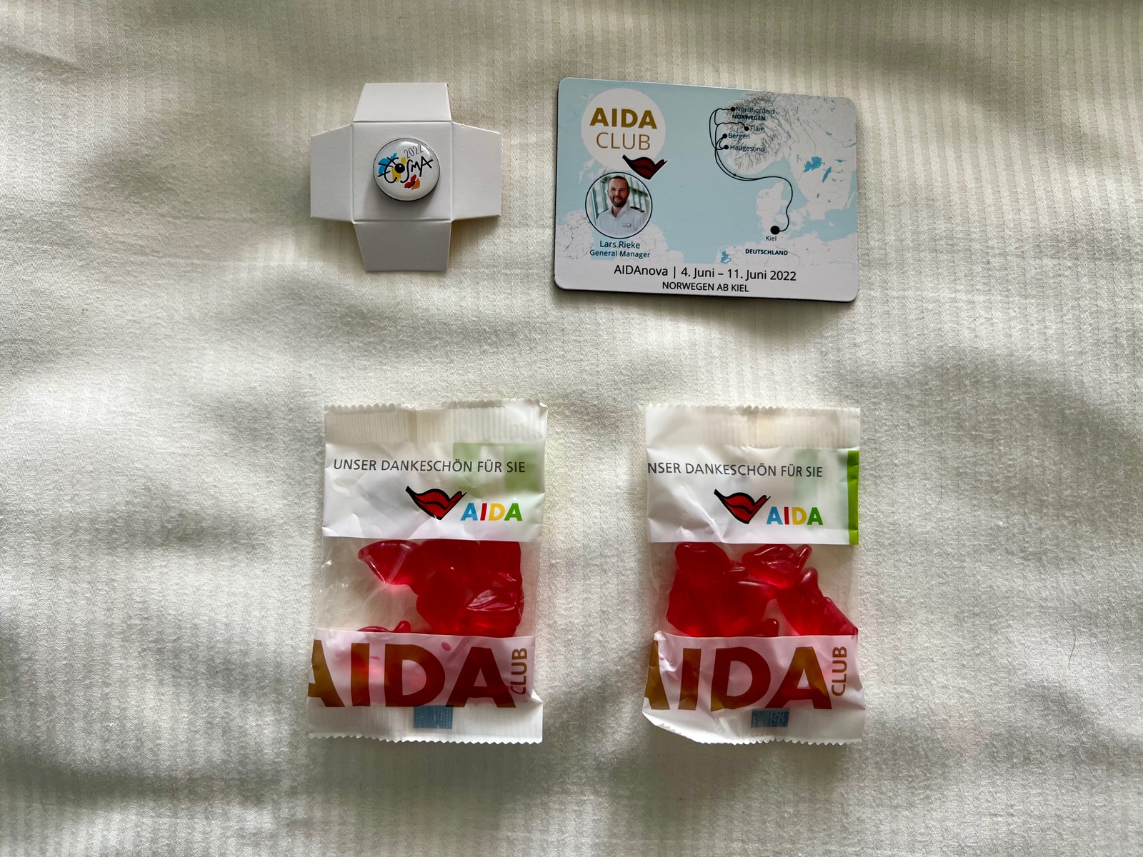 Auf AIDAnova gab es heute als Willkommens-/Abschiedsgeschenk Cosma 2022 PIN, Magnet Reise und Gummi-Kussmünder (Clubstufe Gold, keine Suite).