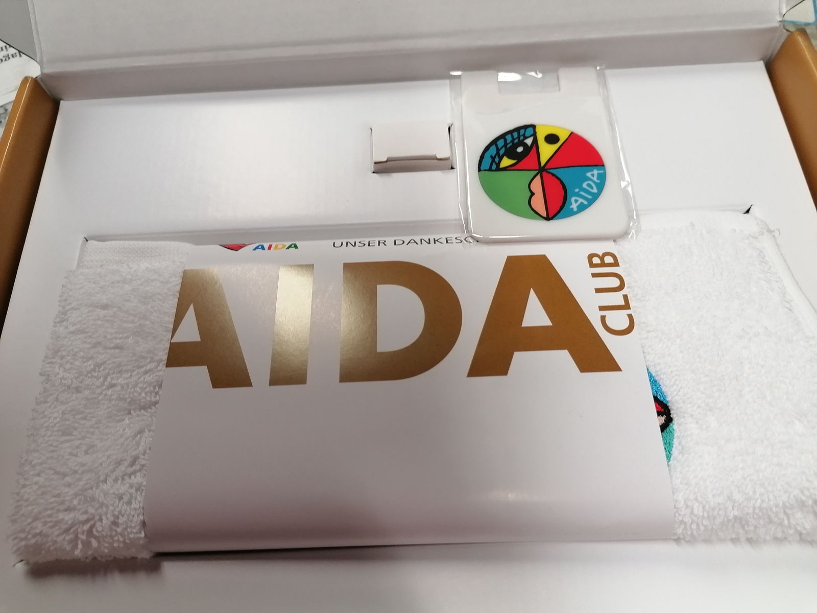 Ich habe heute auch ein Päckchen von Aida bekommen. Inhalt: Handtuch, Kuli, Bordkortenhalter, Pin und ein schöner stabiler Aida Kofferanhänger und Katalog.