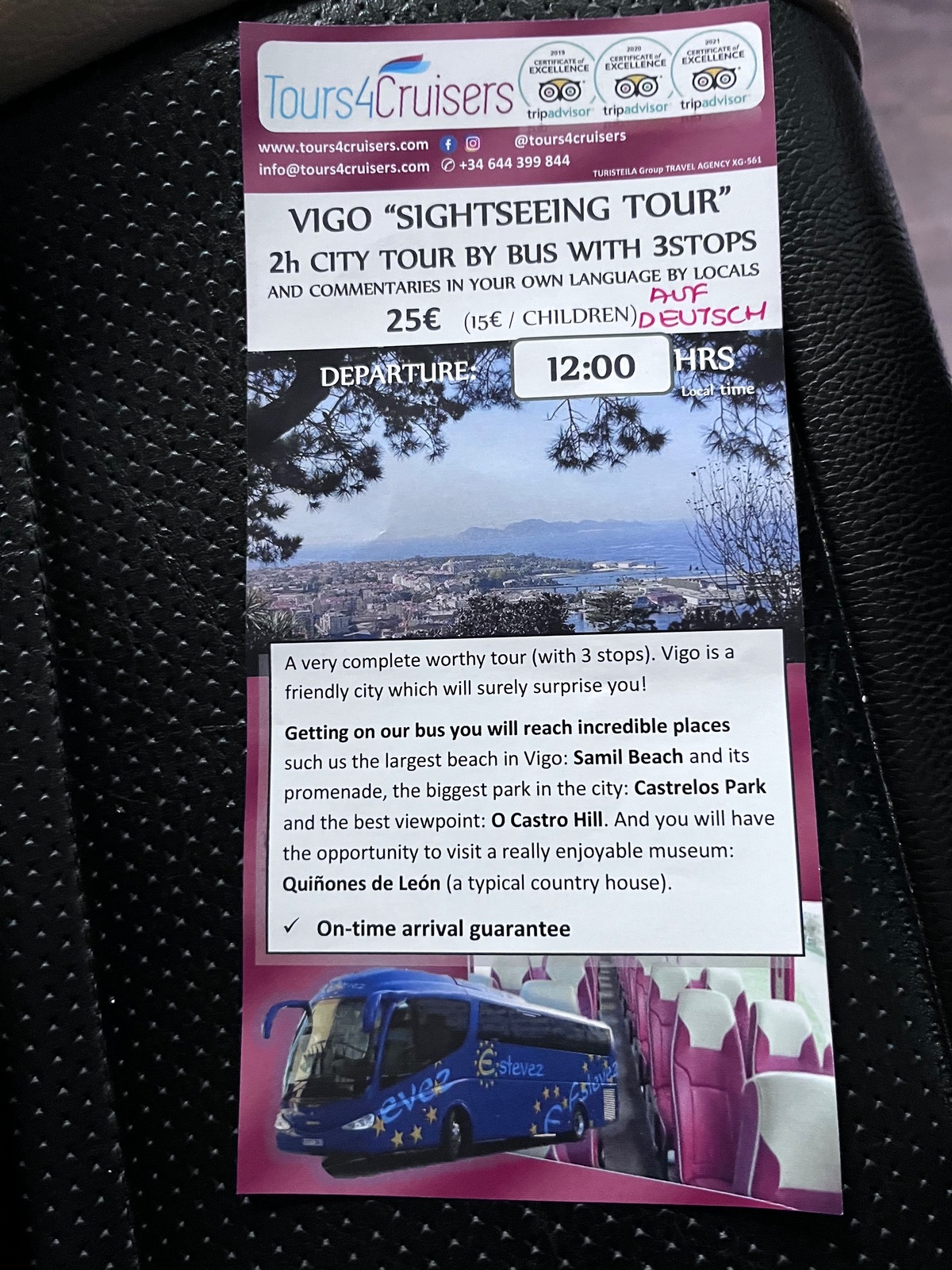 Wir waren auch mit Tour4Cruisers auf der kurzen Stadttour unterwegs! Da wir außerplanmässig umgeroutet wurden waren wir froh kurzfristig eine Alternative zu haben! Reiseleiterin hatte allerdings zu viele Infos über Geschichte und man verstand sie sehr schlecht Ihr Akzent war schon extrem u ihr fehlten auch oft die Wörter. Einige Gäste waren schon etwas genervt. Die Stops waren ok. Wie oben im Flyer abgebildet hatten wir auch den Strand, den tollen Park, wirklich wunderschöne Anlage, leider etwas zu kurz von der Zeit! Dann noch die alte Festung mit dem tollen Rundumblick. Fazit der Ausflug war für 25€ absolut ok, wir waren froh so wenigstens einen Überblick über Vigo zu bekommen.
