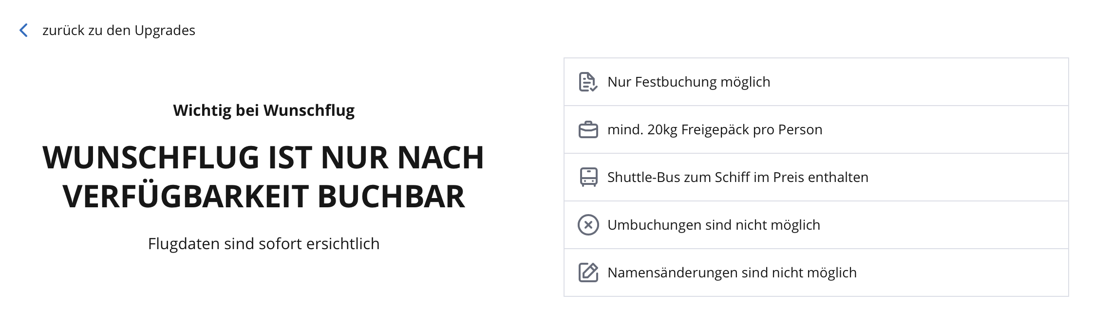 Alleedings die besonderen Buchungsbedingungen beim Wunschflug (Stornierungsbedingungen) im Auge haben.