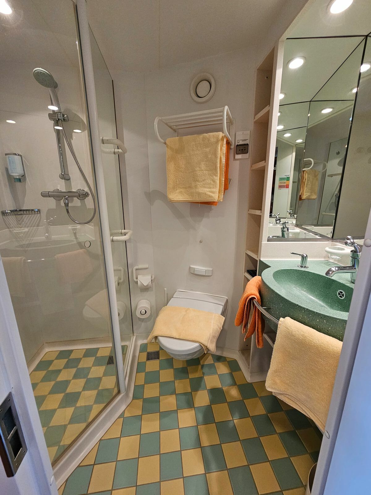 Die Kabine liegt mittig im Schiff, so dass man direkt bei den Treppen ist. Den Seegang merkt man hier natürlich viel weniger als im vorderen oder hinteren Bereich. Absolut ruhig gelegen. Auch das An- und Ablegen hat man nicht mitbekommen. Eine super Kabine, die ich zu 100% nur empfehlen kann.