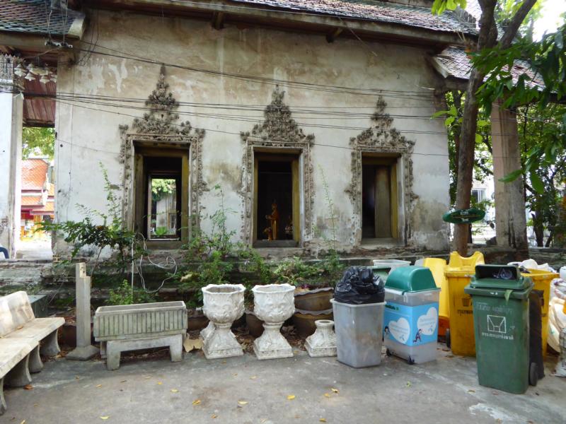 Mein Blick erhascht noch die Santa Cruz Church bevor wir anlegen und ich bin zum zweiten Mal auf dem Gelände des Tempels der Morgenröte (Wat Arun) angekommen. So kenne ich den hohen Turm aber nun nicht, so ganz verhüllt.