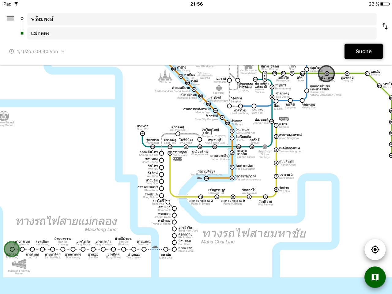 Skytrain ca. 07:30 Uhr hell grün bis Siam, umsteigen in dunkelgrün bis zwei Stationen hinter dem Fluss Wongwian Yai. Hier muss man 13 Minuten zum Bahnhof laufen. Dann geht die grau weiße Linie bis nach Maha Chai. Dann die Fähre nach Ban Laem....hier die Bahn zum Maeklong Railway Market. Setzt Euch in den letzten Wagon...kurz vor dem Markt erlaubt der Schaffner den Zugang zu den leeren Fahrhäuschen und man kann die ganze Fahrt durch den Markt bestaunen und Filmen