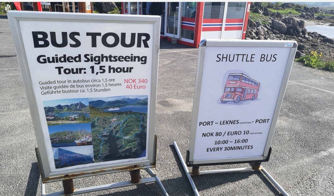 Angeboten wird u.a. ein Shuttlebus nach Leknes Stadtmitte und eine 1,5h stündige Tour rund um die Lofoten für 40€ pro Erwachsener mit dem Anbieter "Artic Buss Lofoten" bzw. "Lofoten Gaver Og Brukskunst". Es geht unter anderem durch die schöne Landschaft zu dem Fischerdorf Ballstad und dann zu einem Aussichtspunkt mit Blick von den Bergen auf die Aida, bevor es dann nach Leknes geht. An den Aussichtspunken konnte man ca. 10min aussteigen und Fotos machen, der Bus wartete. Der Guide im Bus sprach sogar deutsch und gab während der 90 min. Erklärungen zu Land und Leuten. Der Bus fuhr bei uns um 09.30h direkt an der Tenderpier ab, fährt aber mehrmals (ich glaube alle halbe Stunde). Auf dem Rückweg kann man in Leknes Stadt aussteigen und dann später kostenfrei mit dem regelmäßig verkehrenden Shuttlebus zur Tenderpier zurückfahren (in dem 40€-Ticket ist der Rückweg mit dem Shuttlebus schon inkludiert).