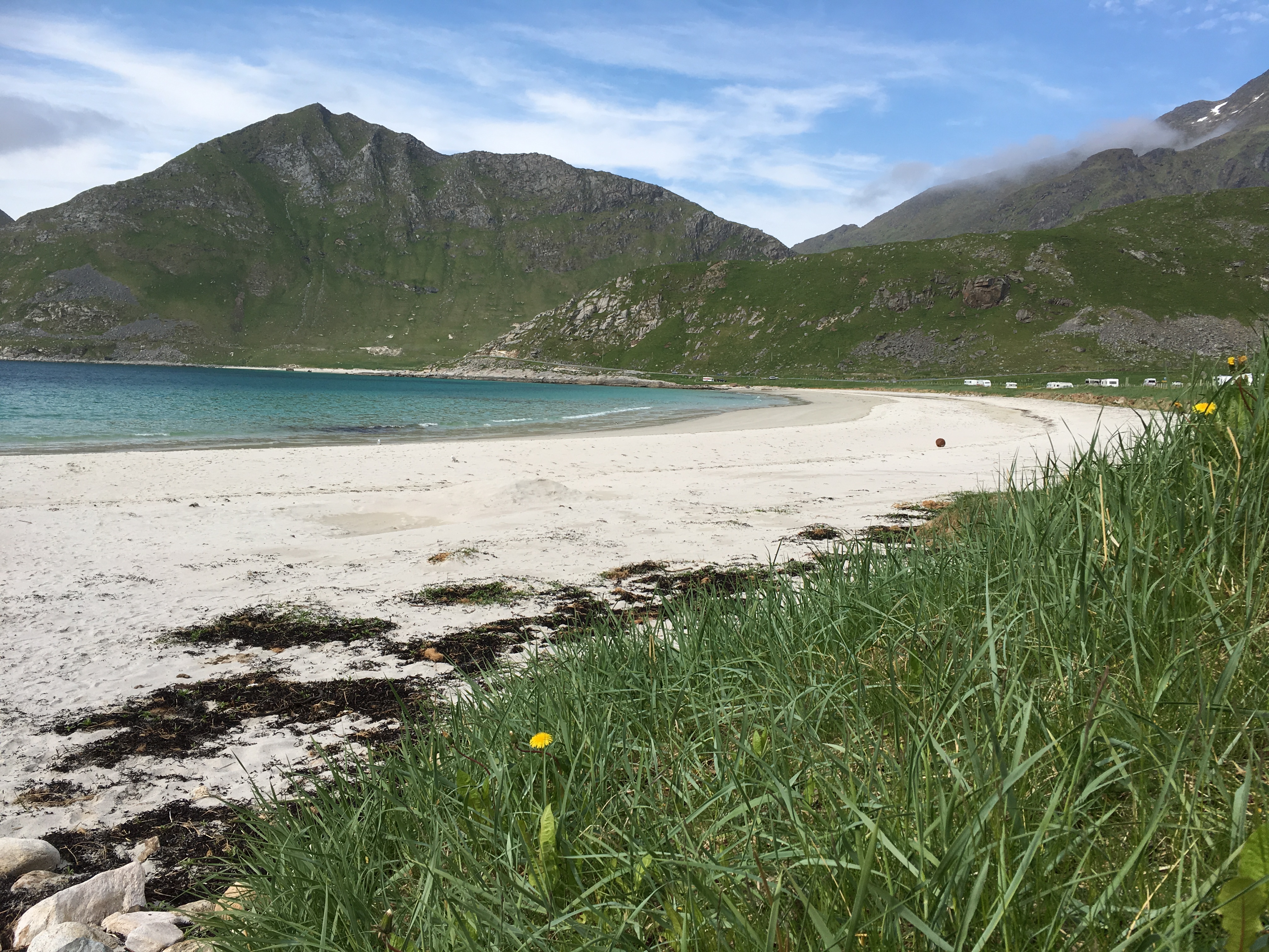 Genau, wir sind zum Haukland Beach gefahren. Eigentlich sind das einfach 12 km, da wir uns aber auf dem Hinweg verfahren haben bzw. der norwegischen Beschilderung geglaubt haben, waren es am Ende ca 30 km. Vor allem die "Umwegstrecke" war - für meine Begriffe - sehr bergig. Insgesamt haben wir ca. 200 Höhenmeter gehabt, und ich war am Schluss ganz schön groggy, bin nicht die große Bergradlerin. Für meinen Mann war es gar kein Problem, aber der ist auf einem anderen Trainingslevel! ;)
