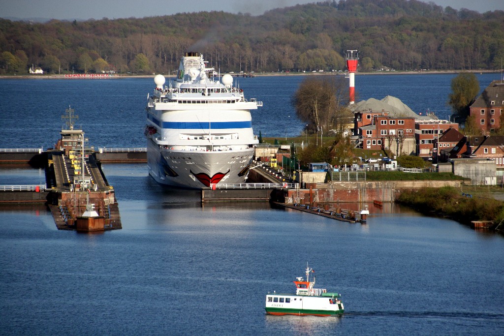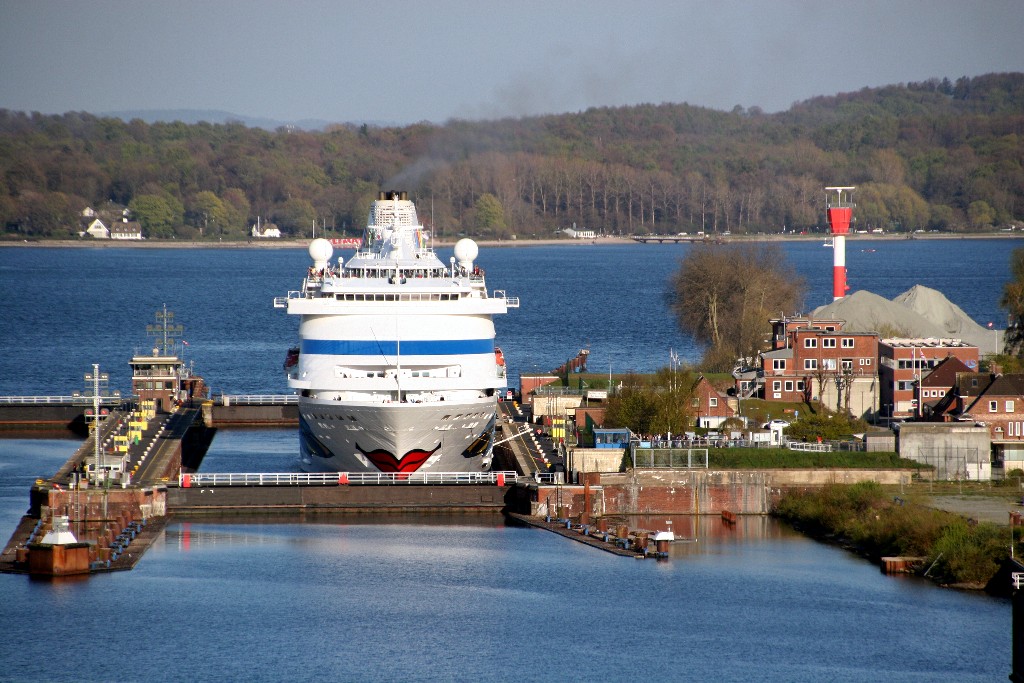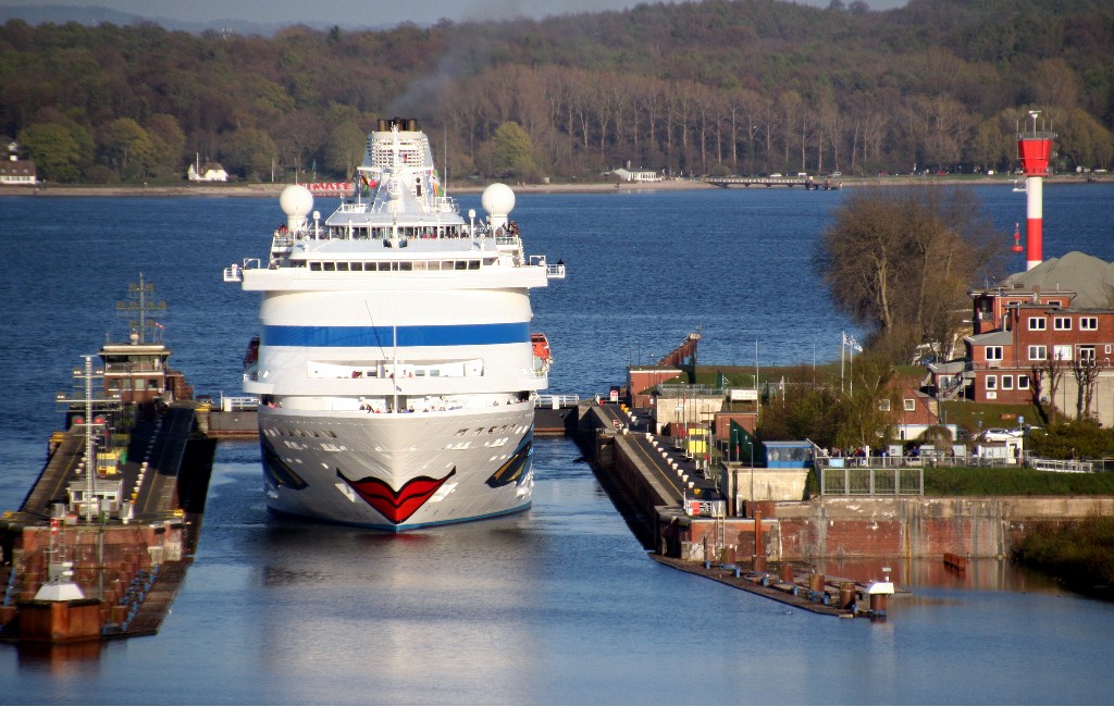 Die AIDAcara in der Südschleuse vom Nordostseekanal (das Schleusentor ist noch geschlossen)