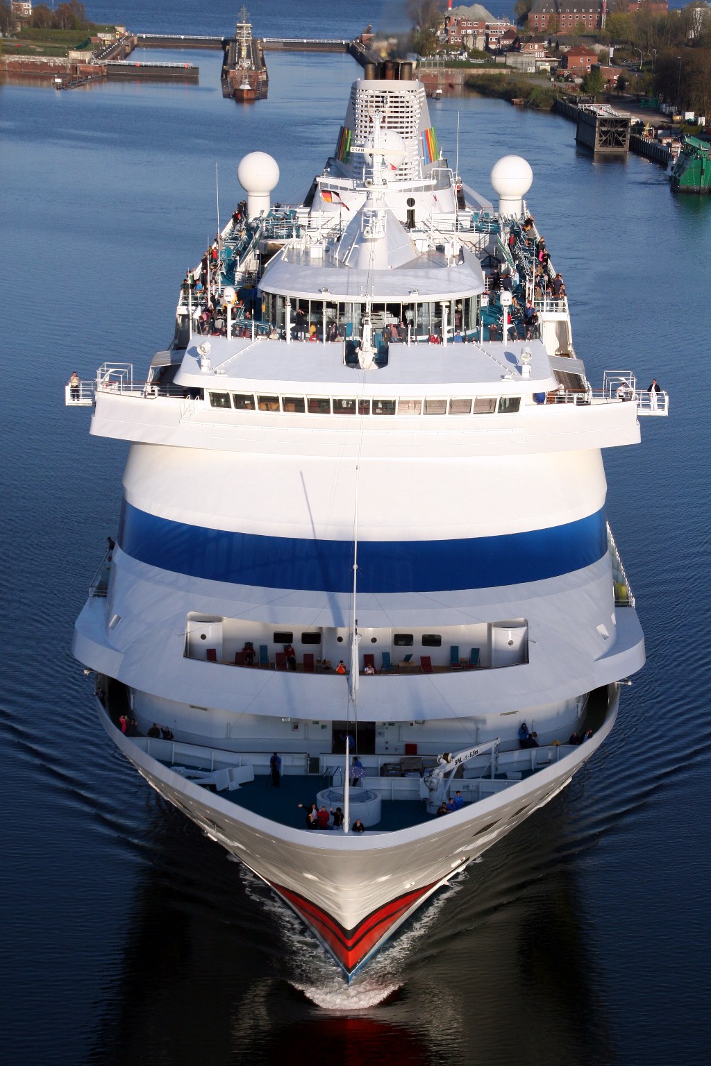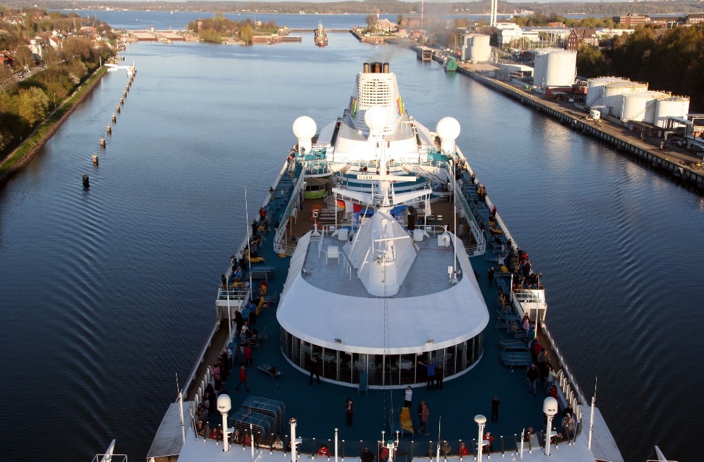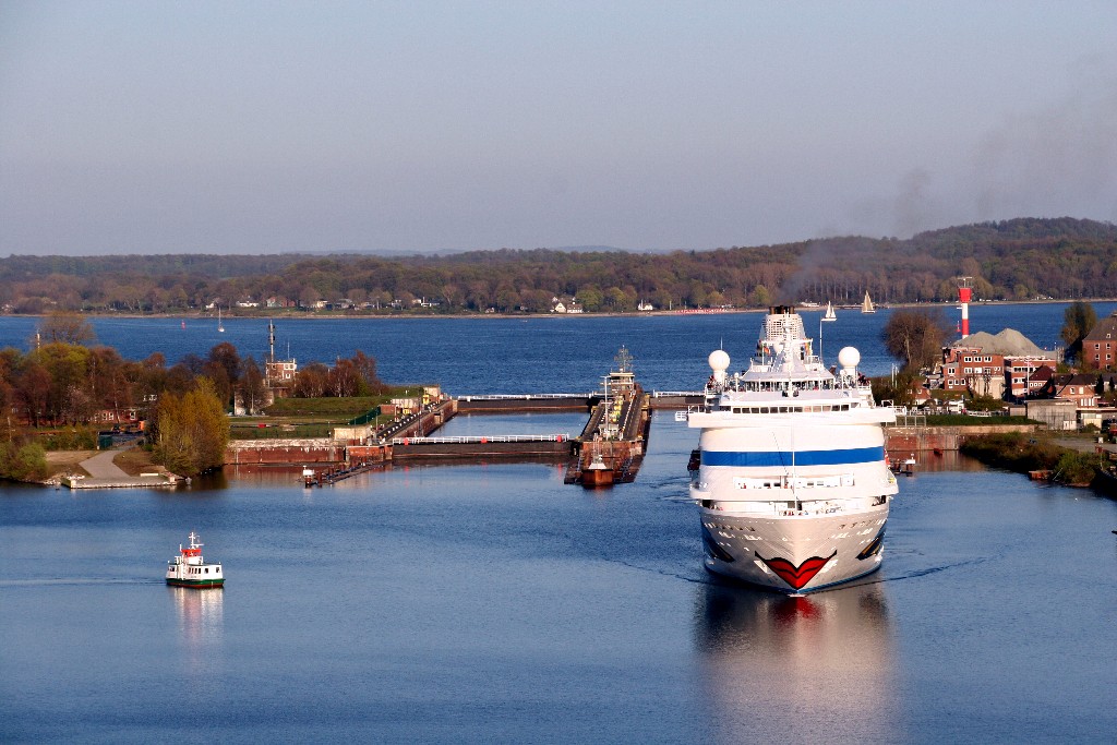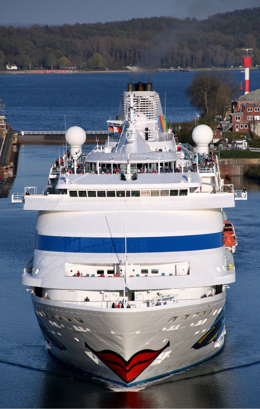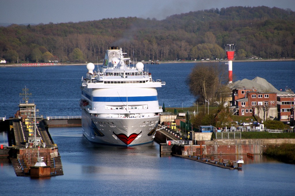 Die AIDAcara fährt jetzt ihr Auslaufmanöver in der Südschleuse vom Nordostseekanal