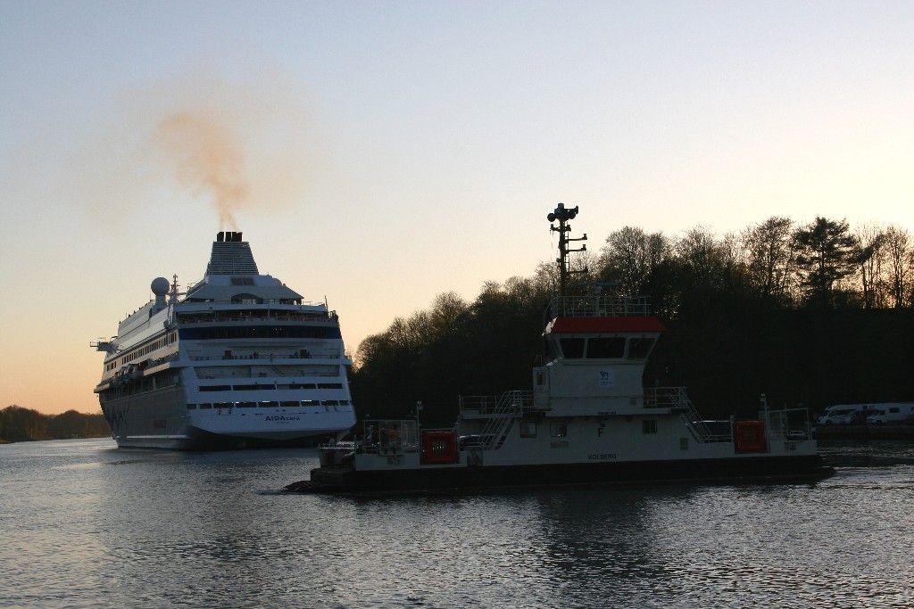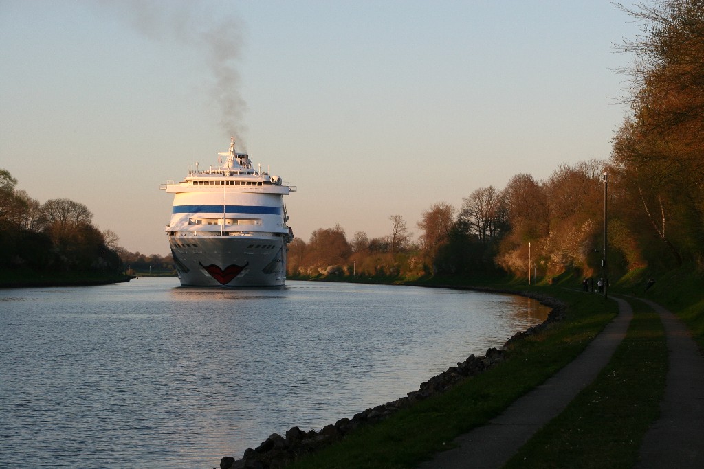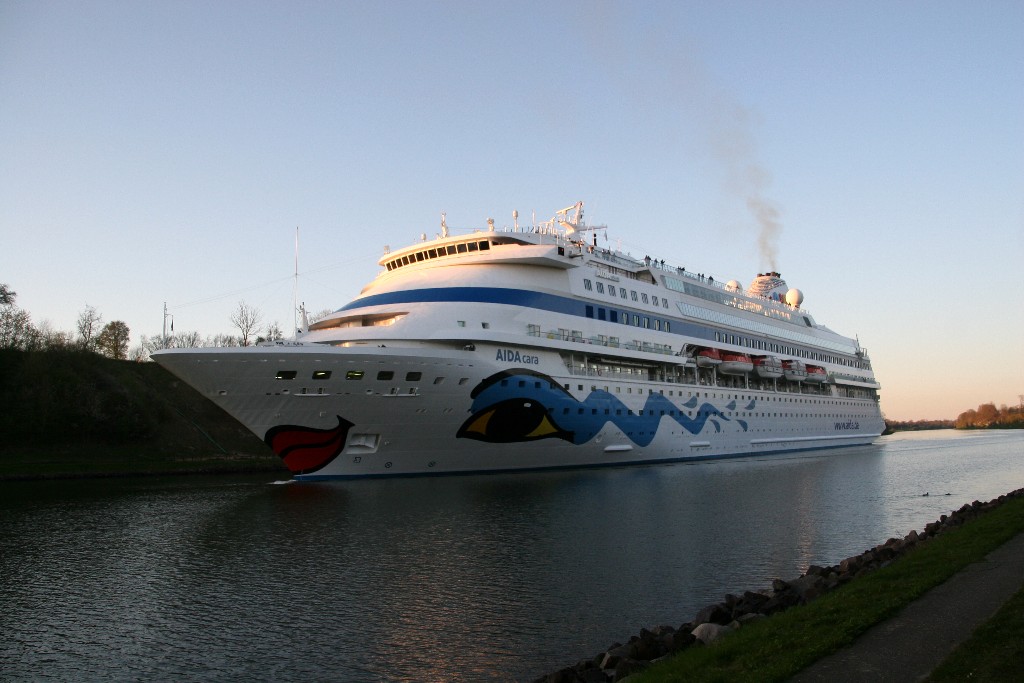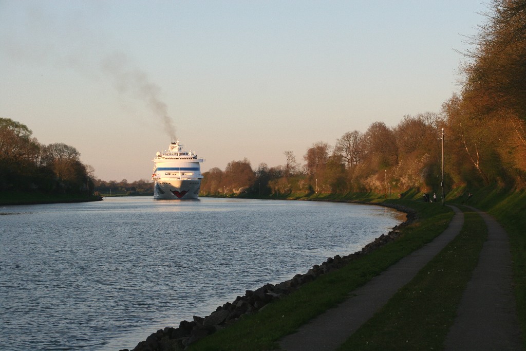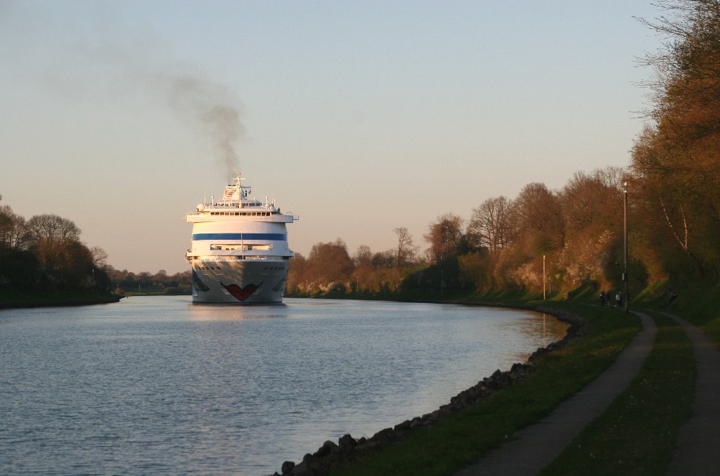 Die AIDAcara in abendliche Stimmung im Nordostseekanal kurz vor der Kanalfähre "Landwehr"