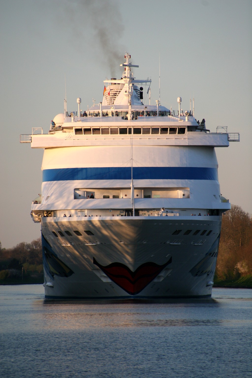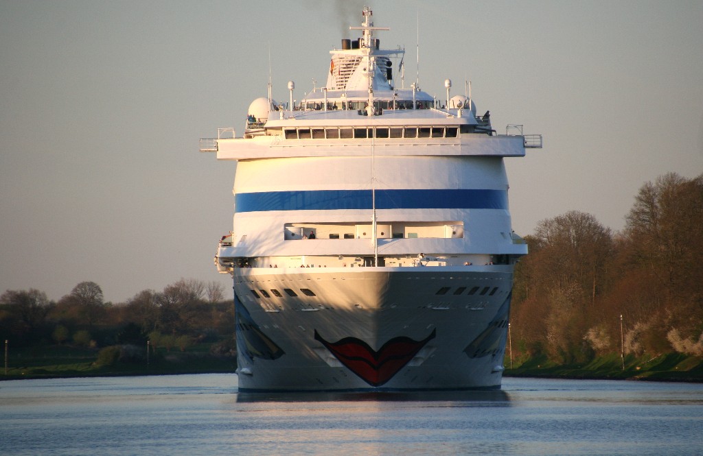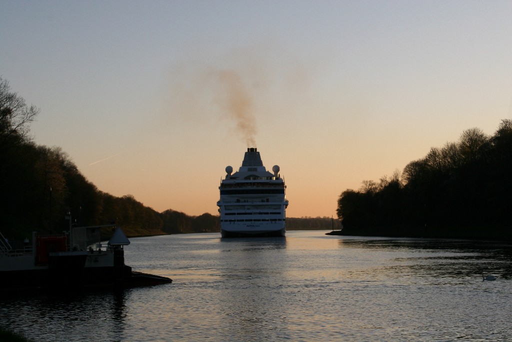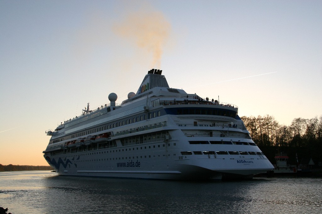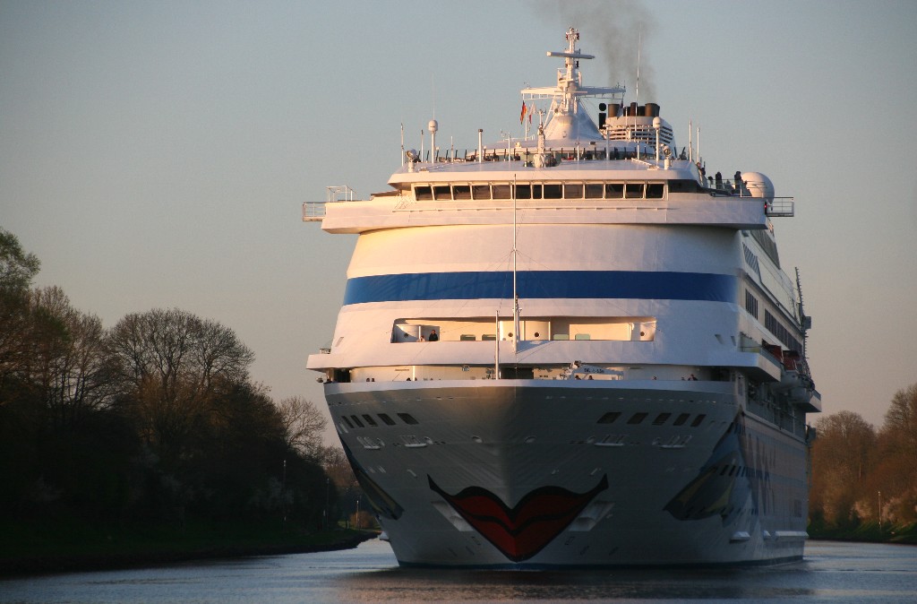 Die AIDAcara mit einem kräftigen "Heizergruß" in abendlicher Stimmung im Nordostseekanal