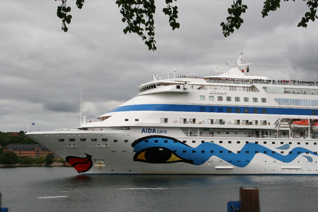 Die AIDAcara ist in der Höhe vom "Marine-Ehrenmal" in Laboe angekommen